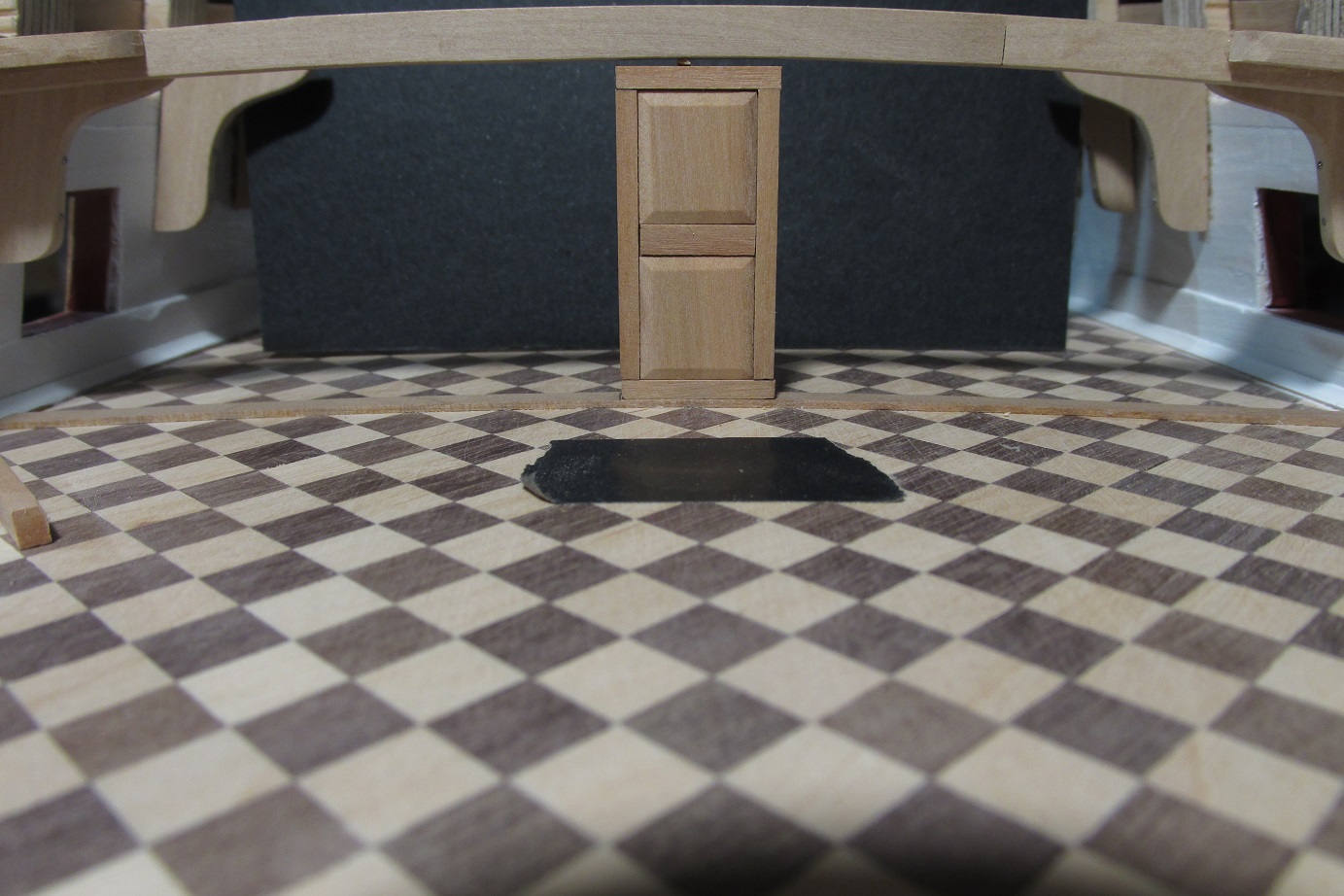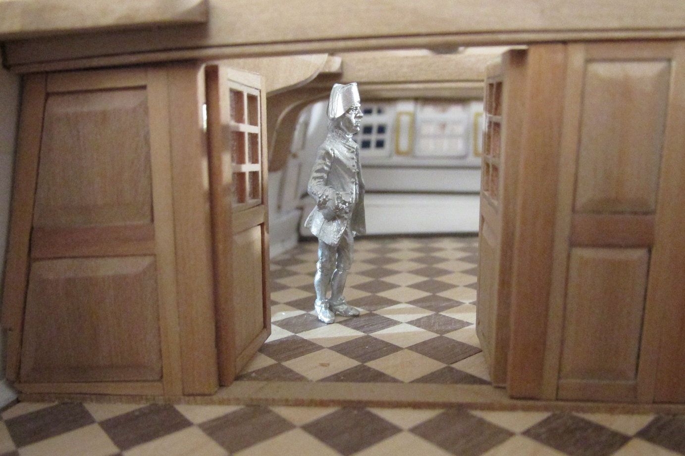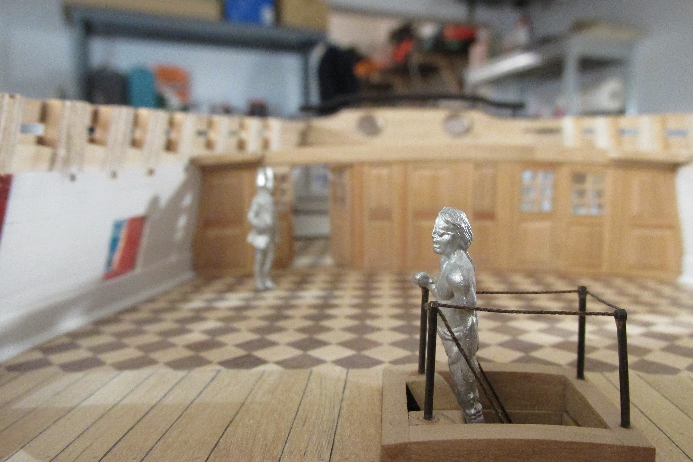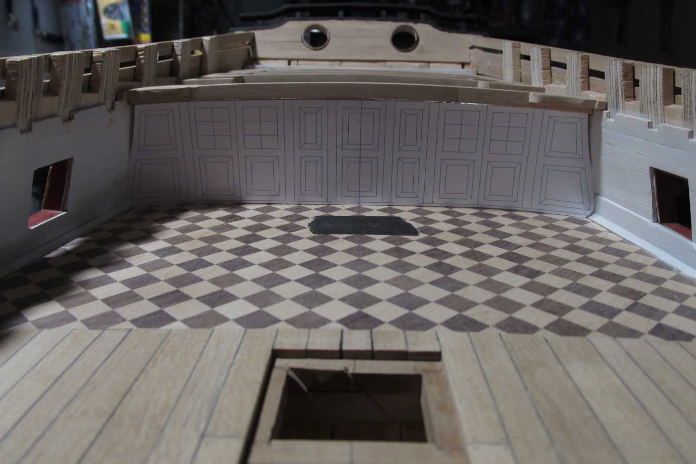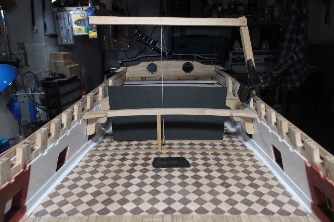 Dalej ciągnę ściankę pod quarter deckiem, ponieważ tokarka wróciła już z serwisu, to mogłem wytoczyć zawiasy do drzwi i je zamontować.