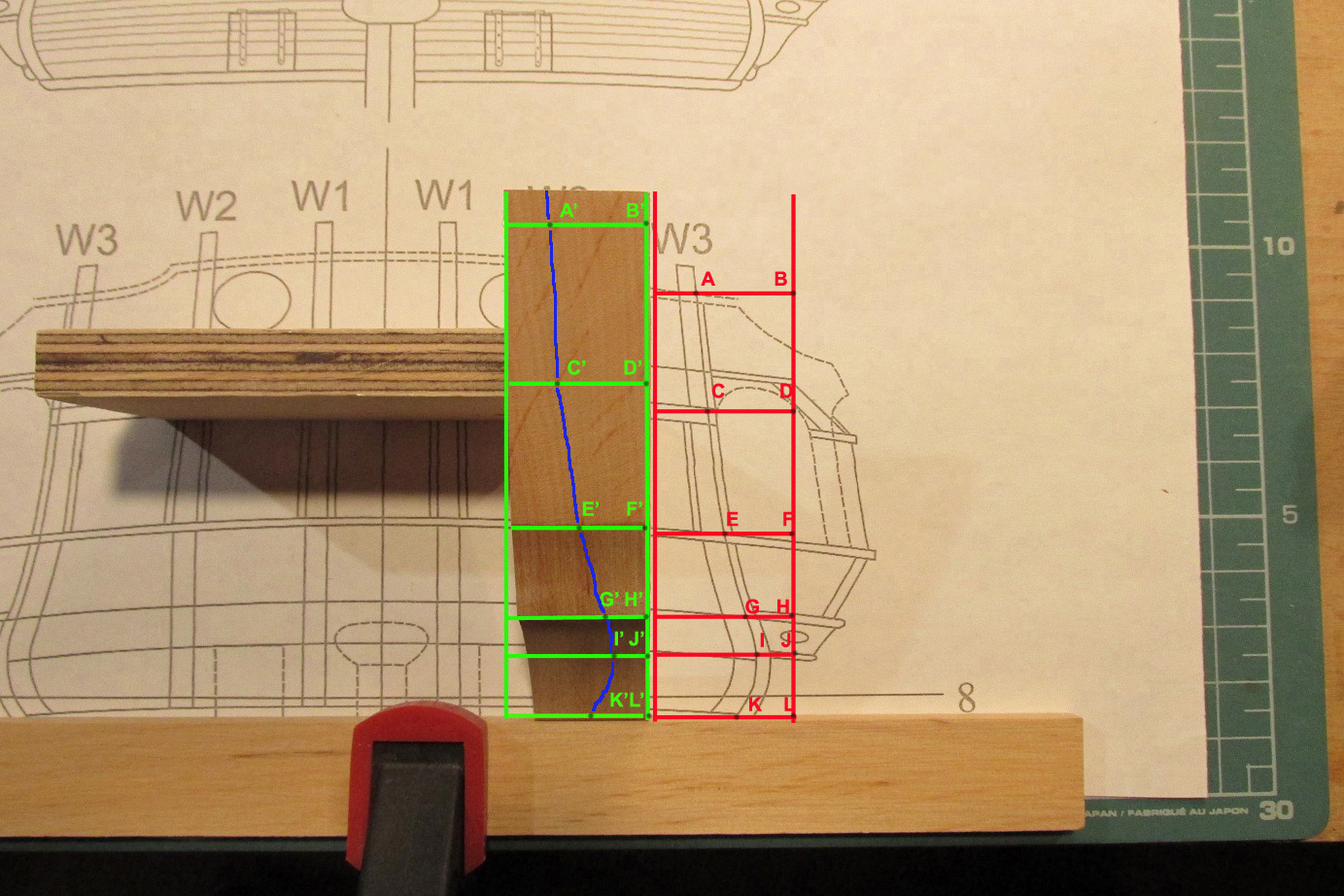 Po czym weź cyrklem odstępy na planie miedzy prawa krawędzią (prawa linią pionową w/w szerokosci) a punktem przecięcia się owej krzywizny na danym poziomie (oznaczone czerwonymi literami A,B,C,D, etc.) i przenieś te wymiary na drewno (zielone litery A',B',C',D', etc). Zrób tak dla wszystkich poziomów, po czym połącz za pomocą krzywika wszystkie punkty w linię krzywą (tu w kolorze niebieskim) i uzyskasz w ten sposób prawą krzywiznę owego elementu (belki rufowej) - calość procesu podobna do procesu wykreślania wręg z linii teoretycznych kadłuba.