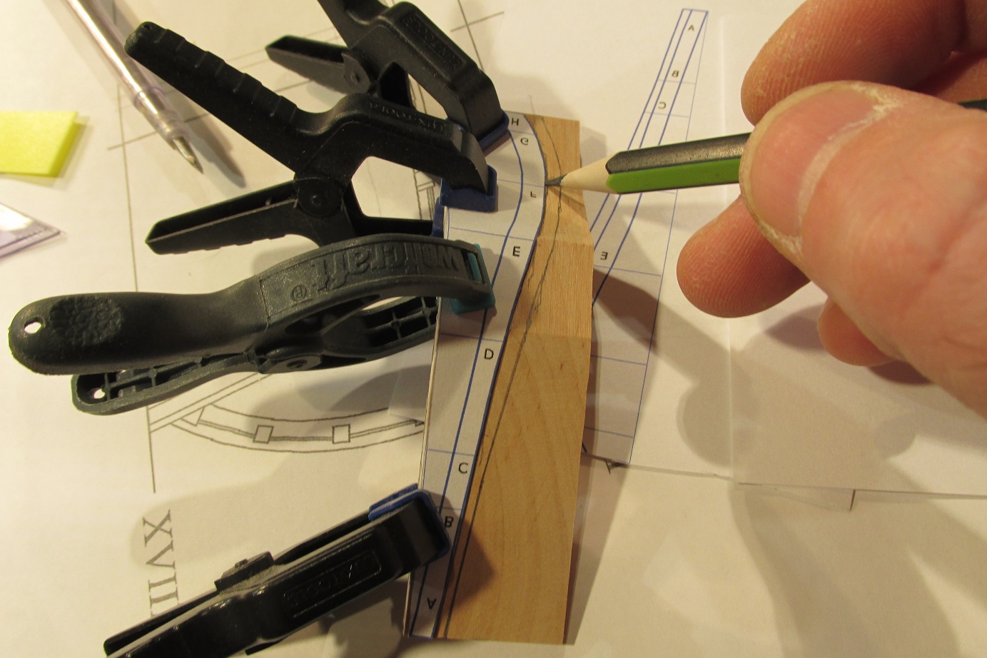 Zrob to samo z lewą krawędzią owego elementu, biorąc cyrklem odstępy między lewą linią pionową wyrysowaną wcześniej na planie a punktami przecięcia się owej lewej krzywizny na planie - dla każdego wyrysowanego na planie poziomu i poprzenoś te odstępy na drewno.