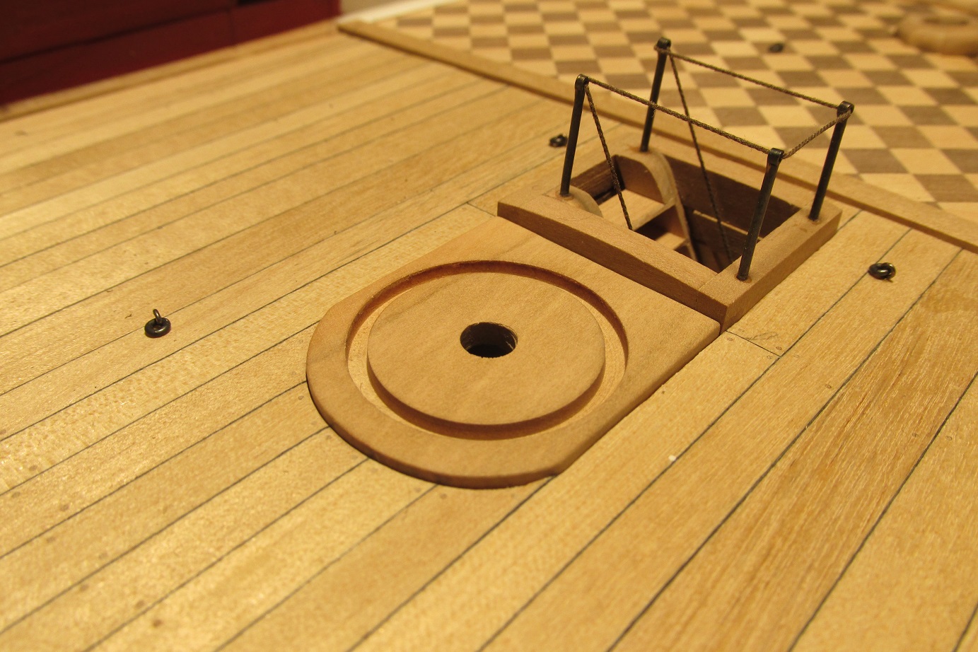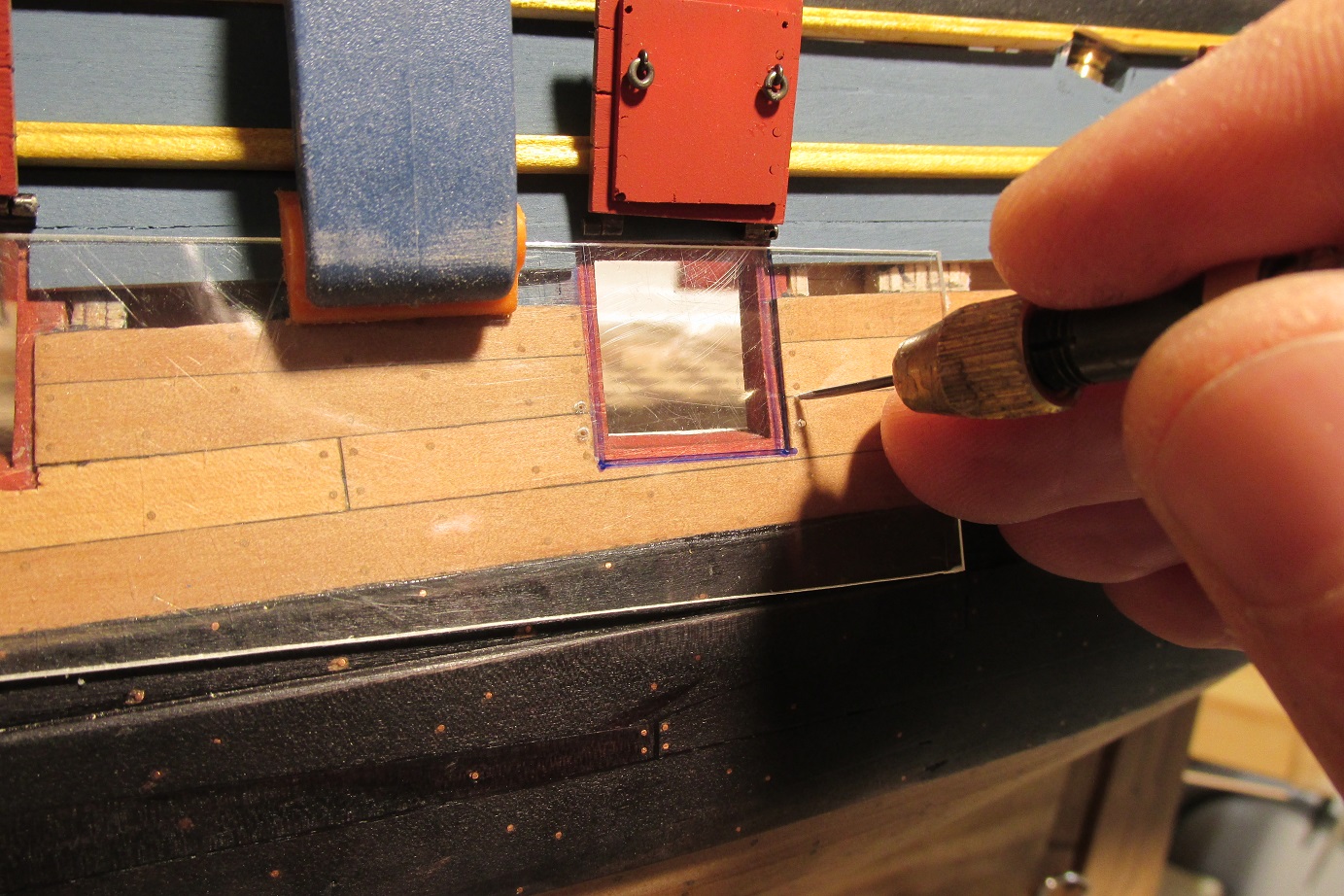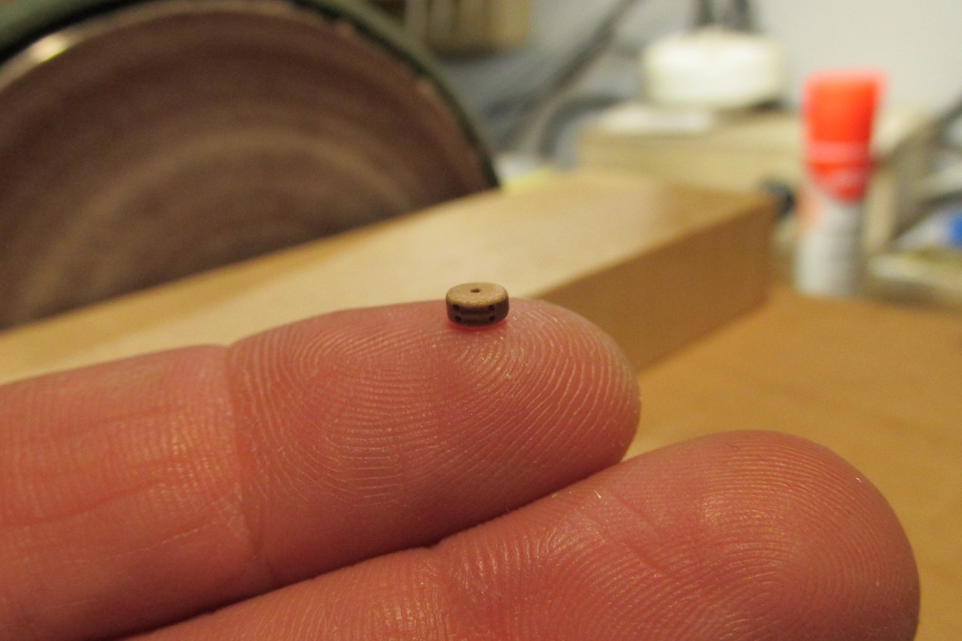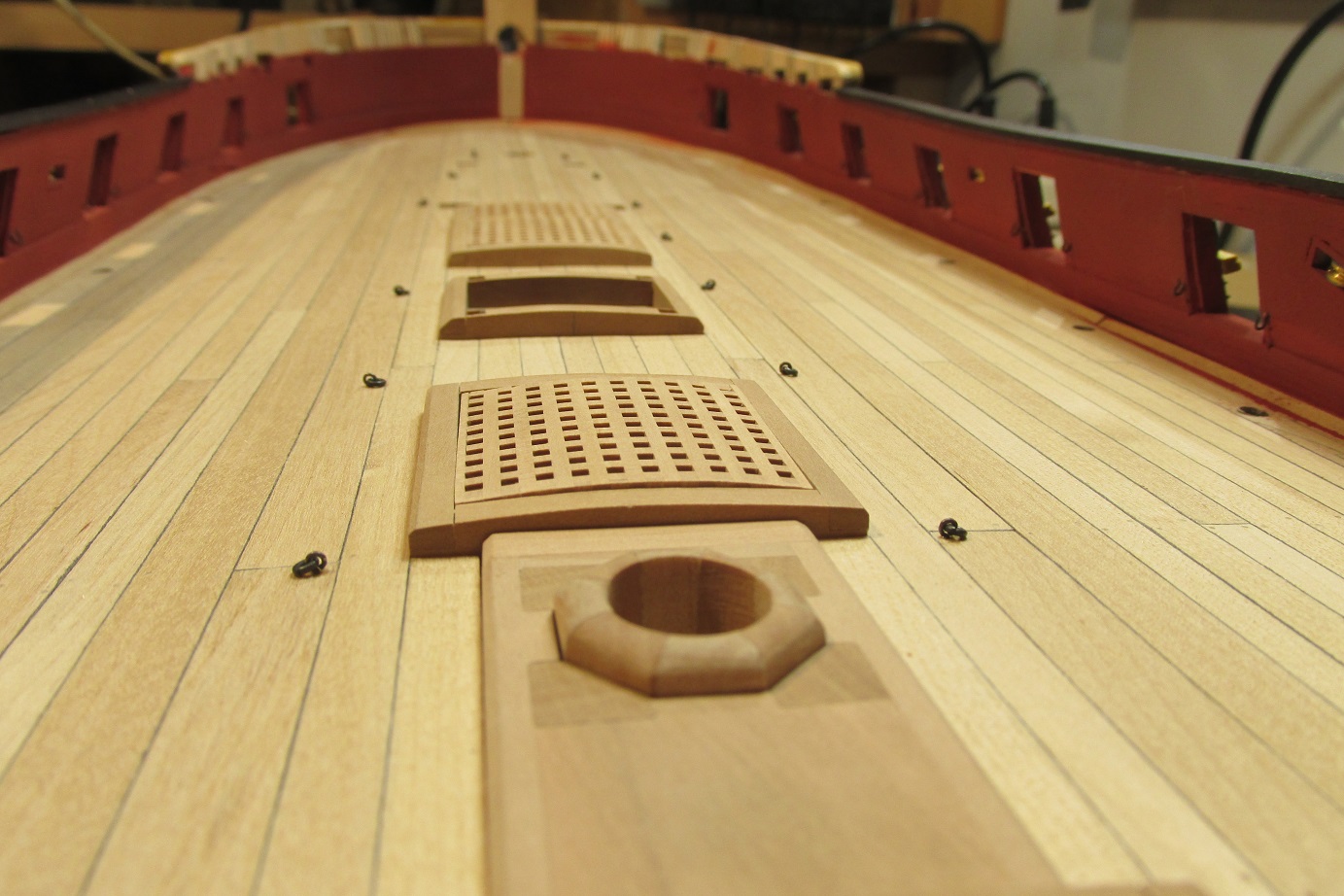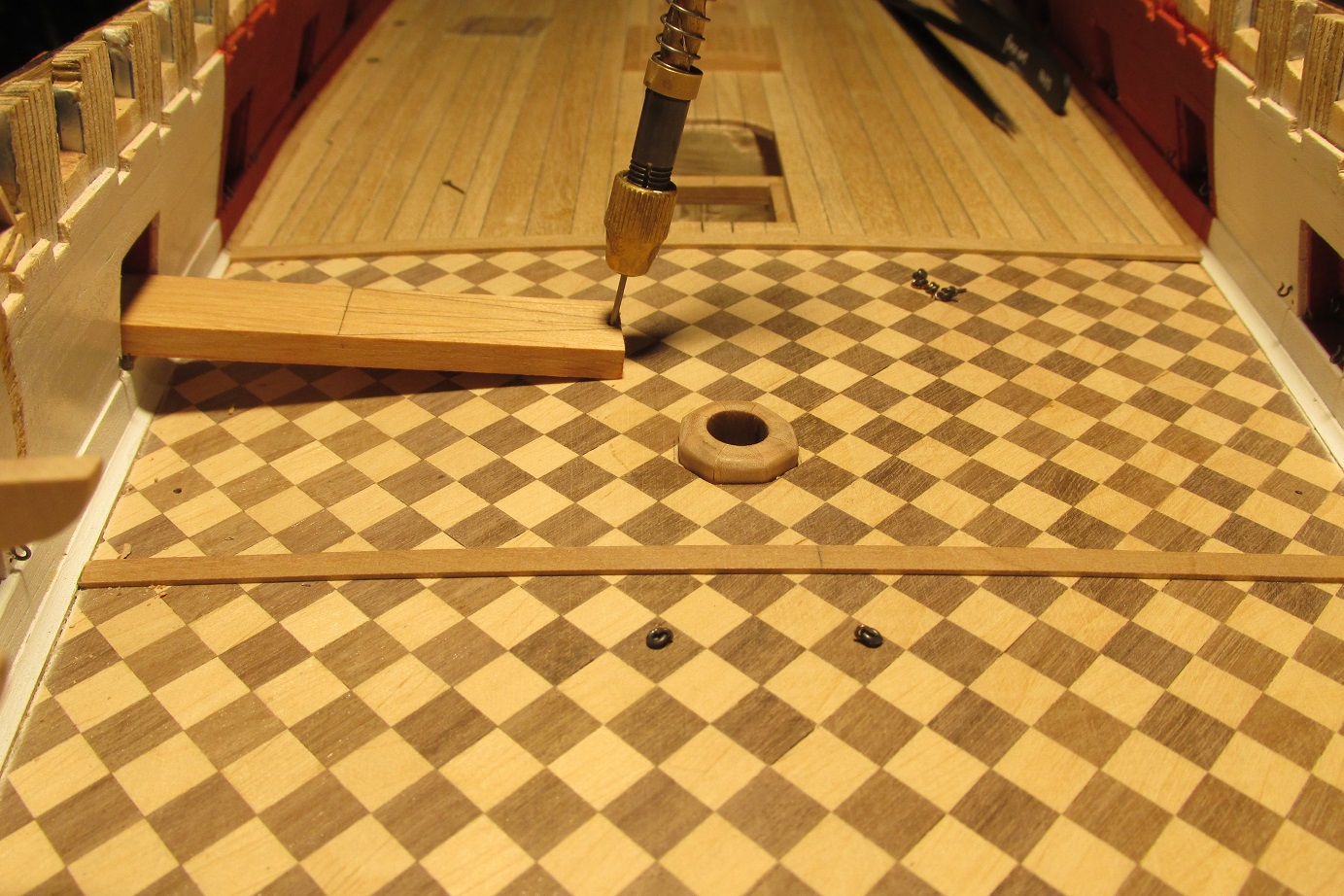 Zmieniłem również koncepcje zawiasów furt. Początkowo, jak widać na wcześniejszych zdjęciach, chciałem zrobić je płaskie, takie podpatrzyłem na Victory. Ale jak się porozglądałem w innych relacjach i literaturze, to okazuje się że chyba powinny być to zawiasy w kształcie walca z bolcem. Takie też wytoczyłem i będę montował.