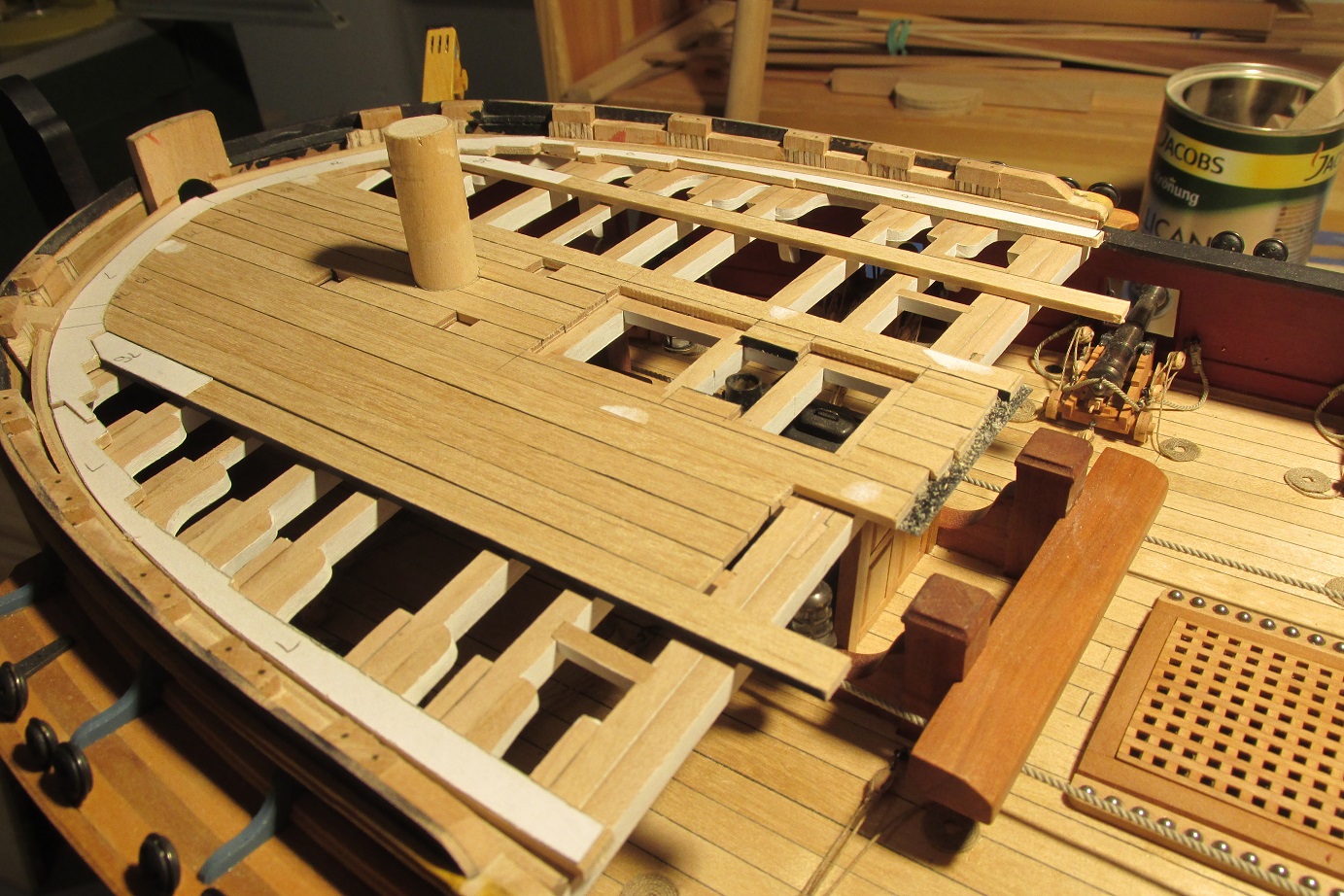 Rozpocząłem przyjemniejszy etap deskowania pokładu forecastle. Pomalowałem i wkleiłem pokładniki pod quarterdeck.