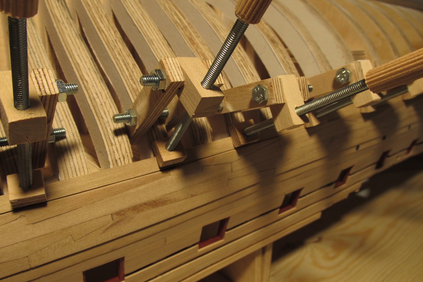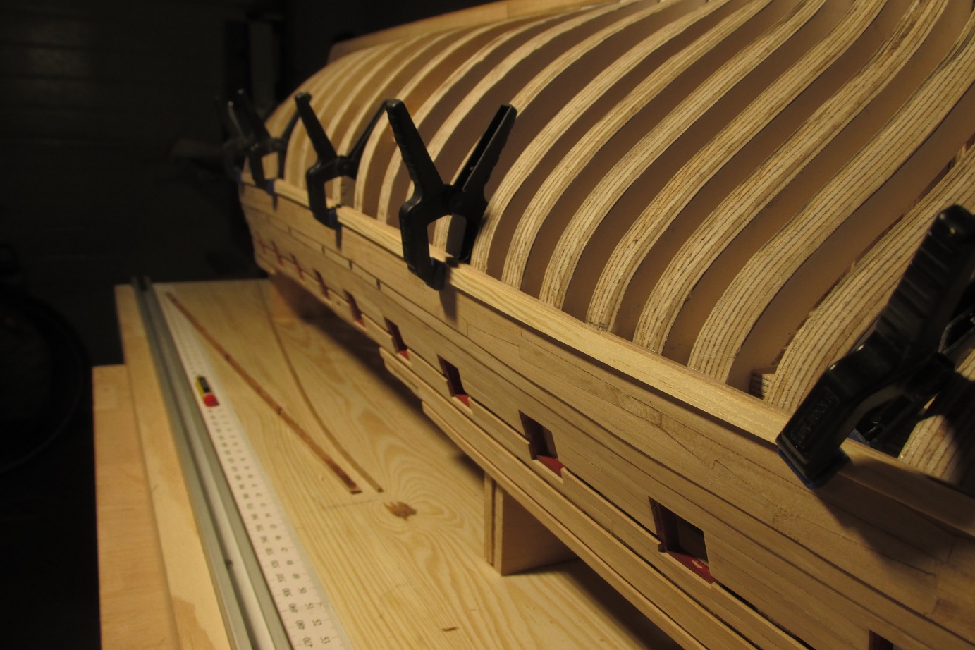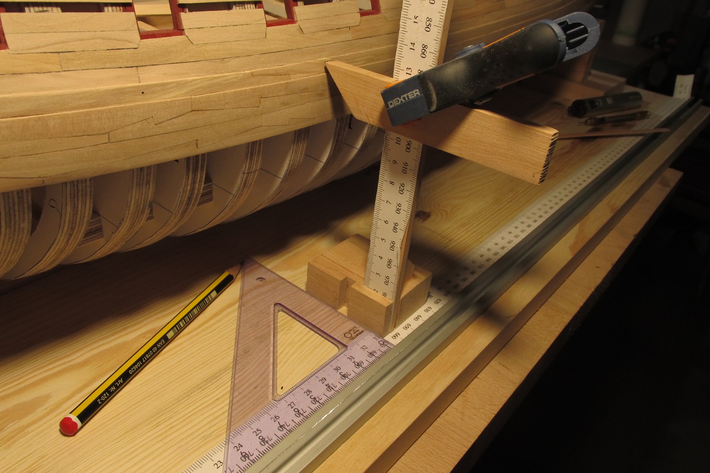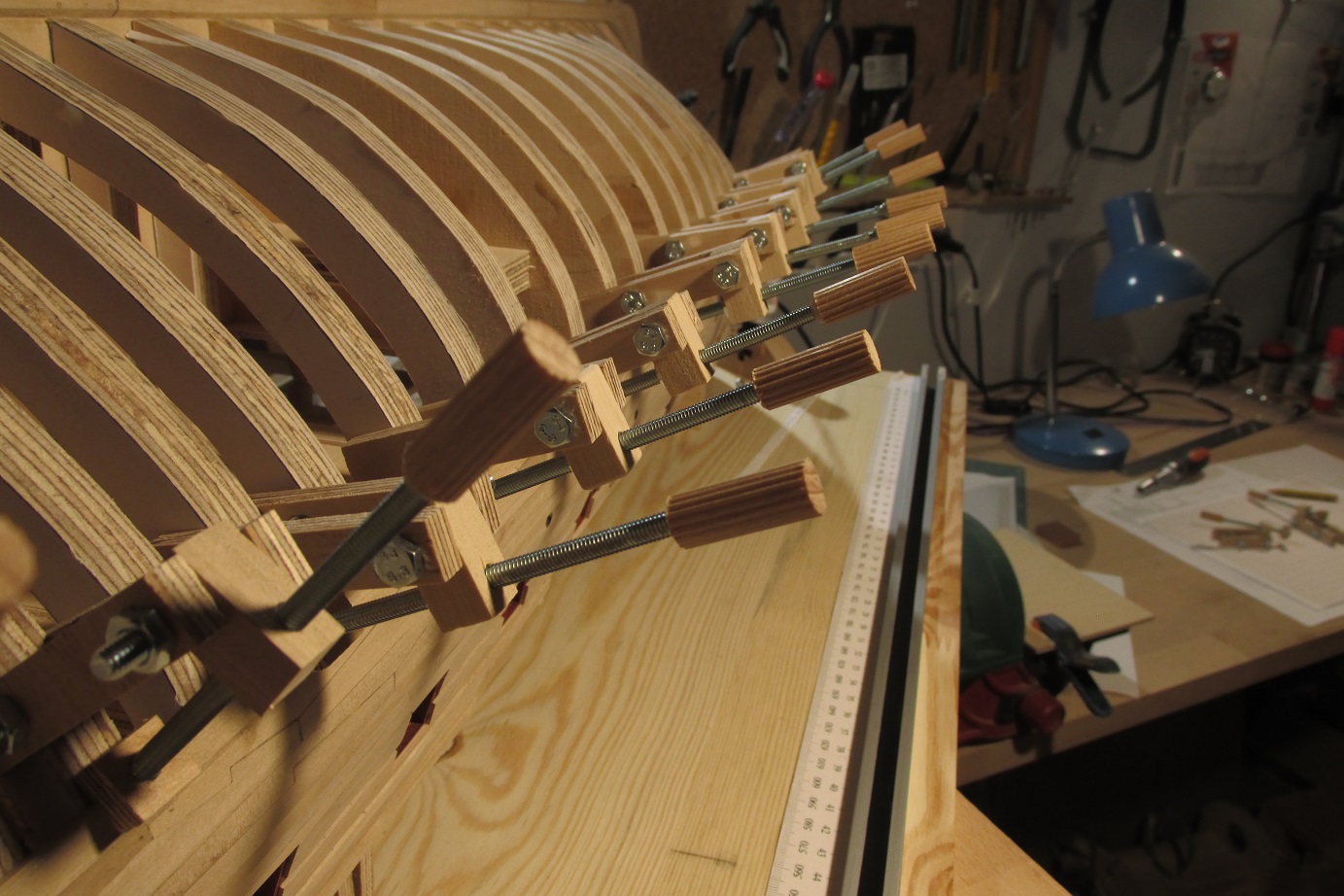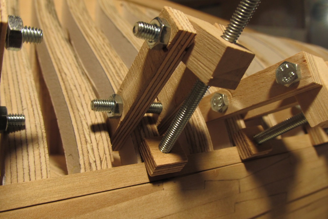 A ja się ciągle przygotowuję do poszywania dennej części burt. Wyrównałem pas odbojowy i wymyśliłem dociski, których działanie przerosło moje oczekiwania. Ich zaletą jest to że dadzą się użyć prawie w każdym miejscu poszywanego kadłuba.