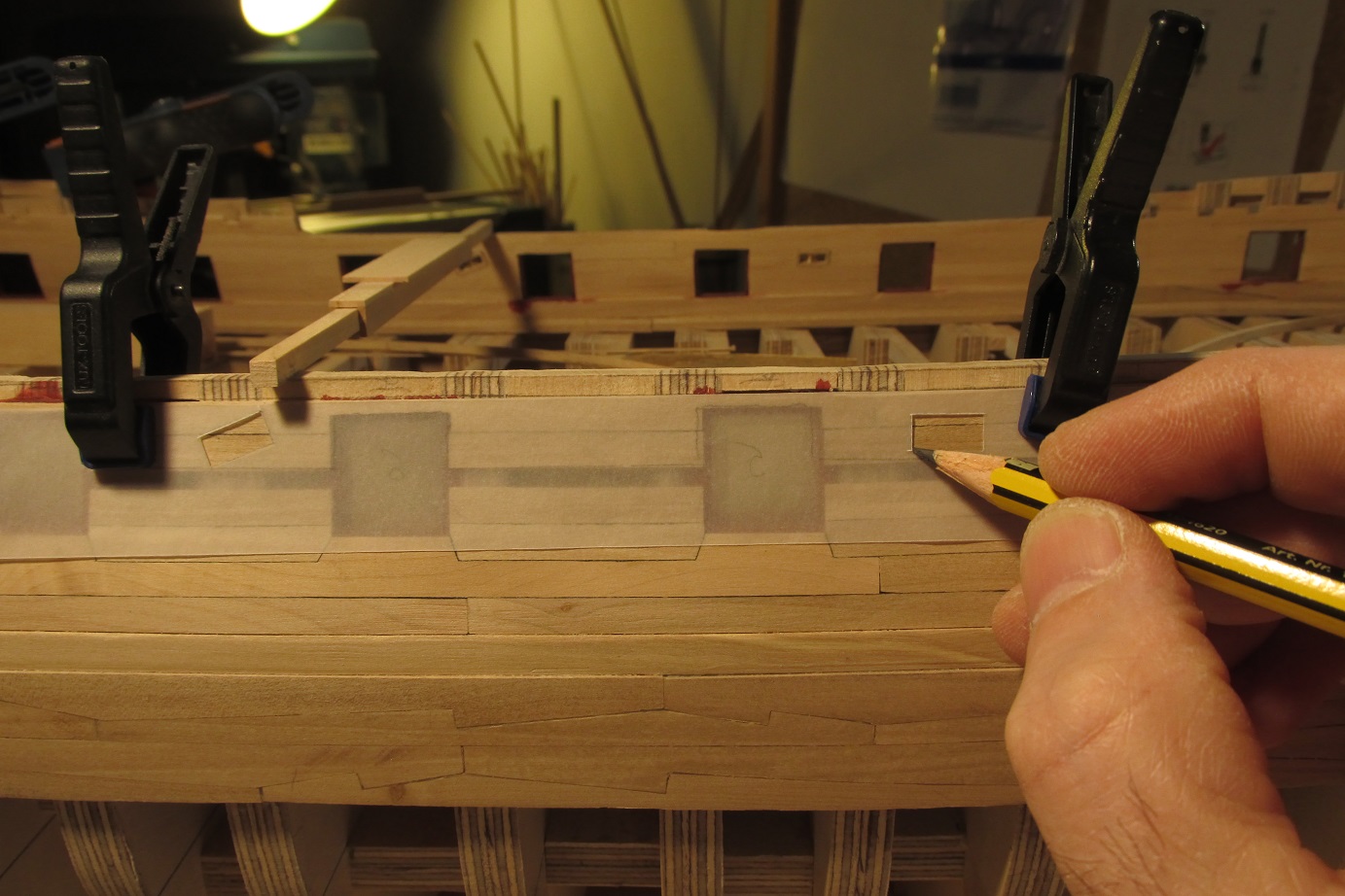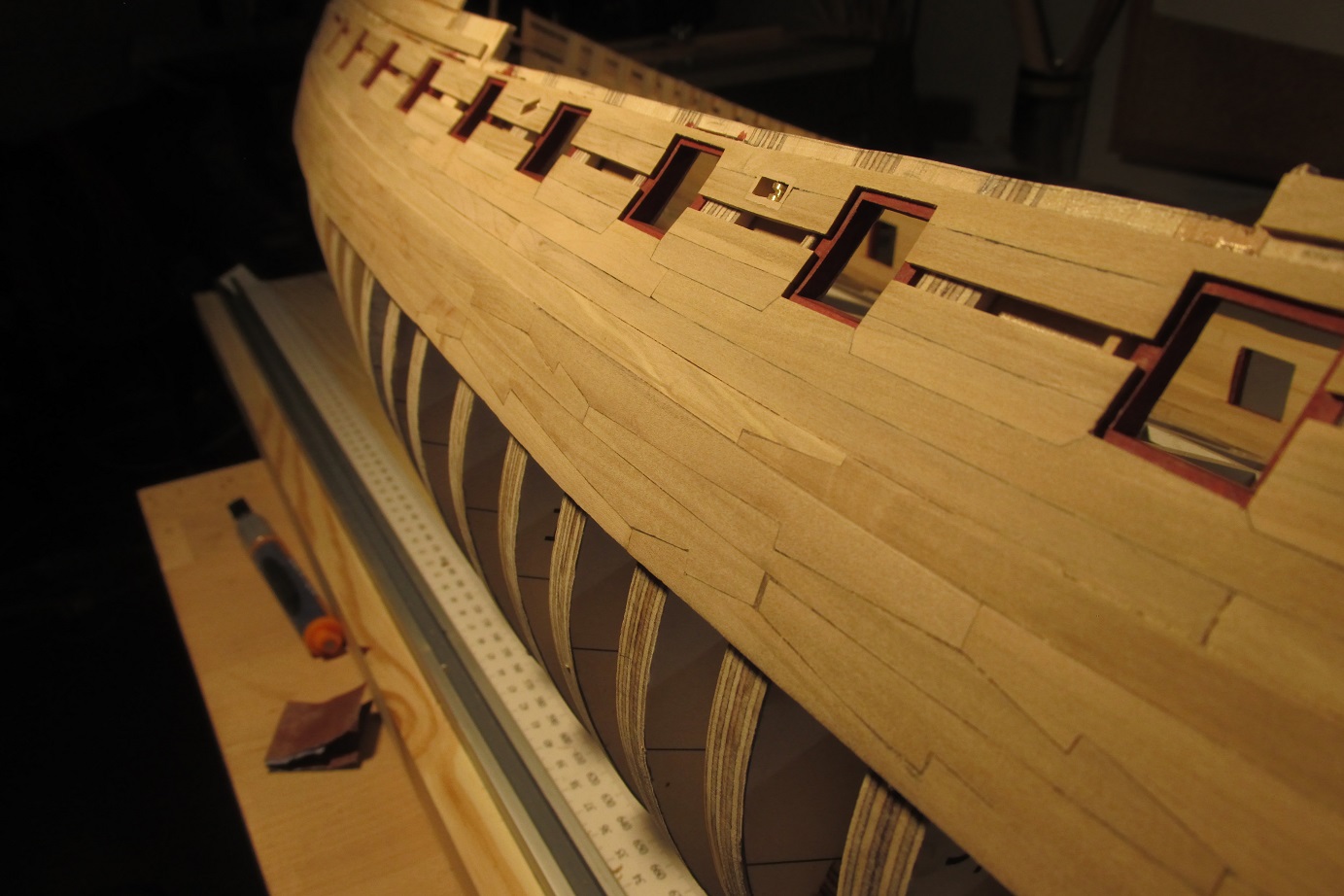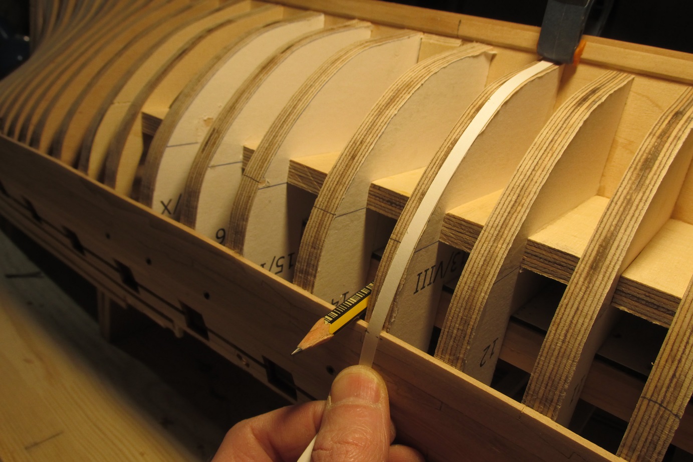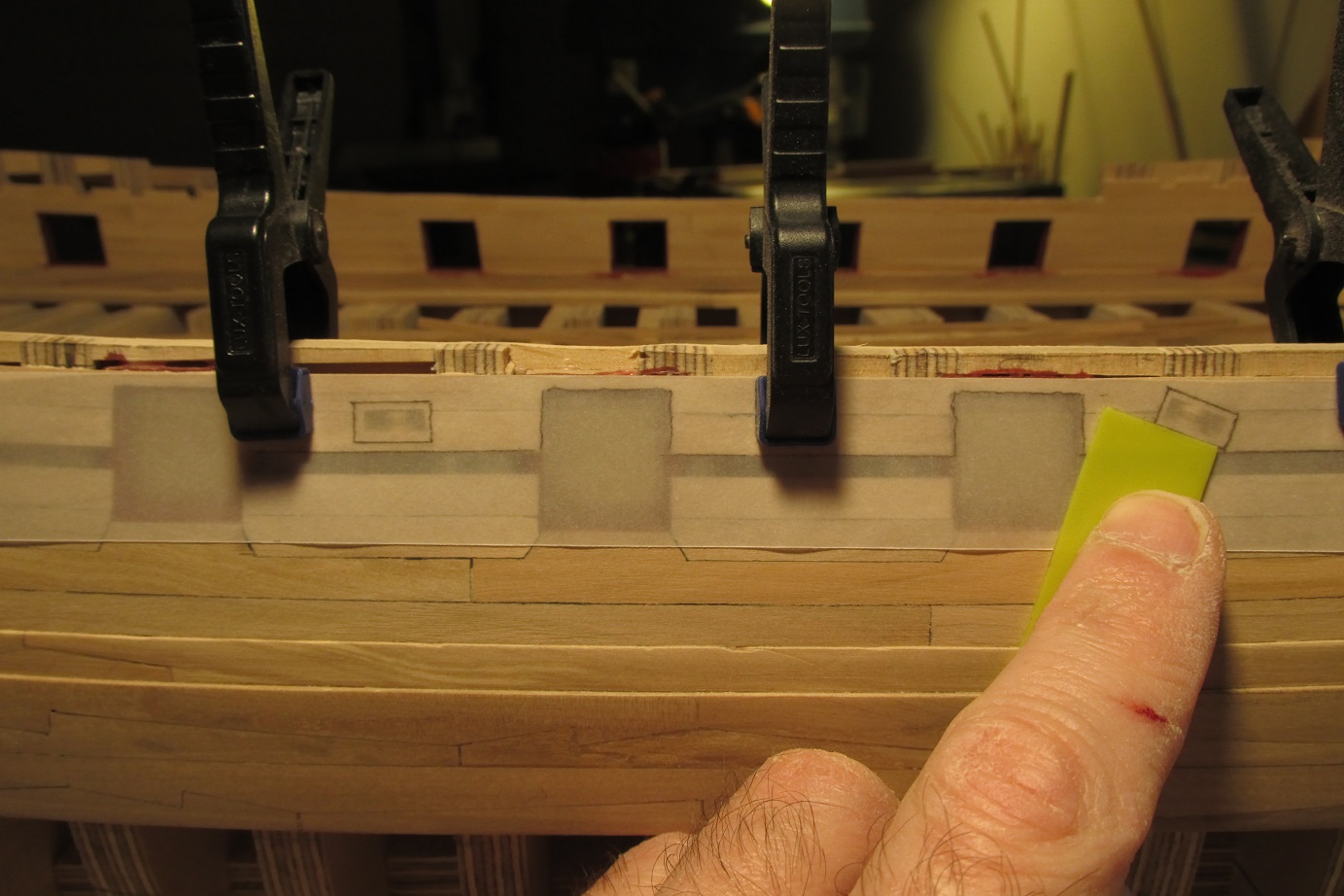 A ja się ciągle przygotowuję do poszywania dennej części burt. Wyrównałem pas odbojowy i wymyśliłem dociski, których działanie przerosło moje oczekiwania. Ich zaletą jest to że dadzą się użyć prawie w każdym miejscu poszywanego kadłuba.