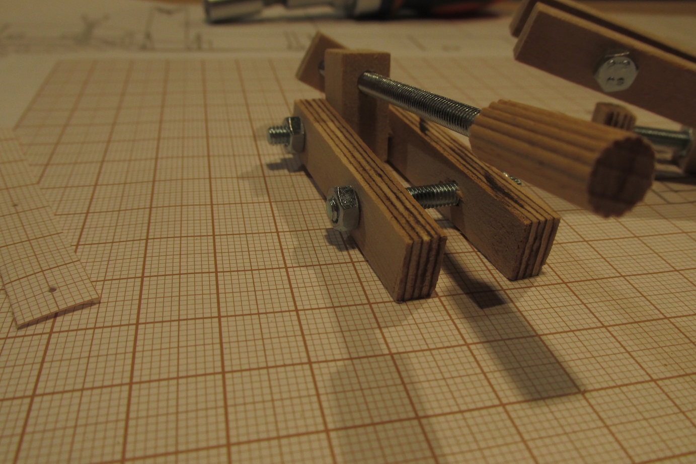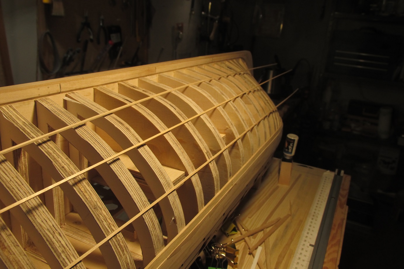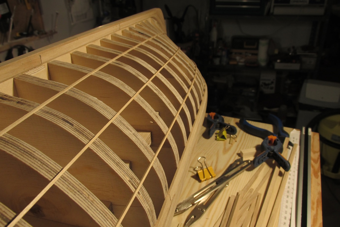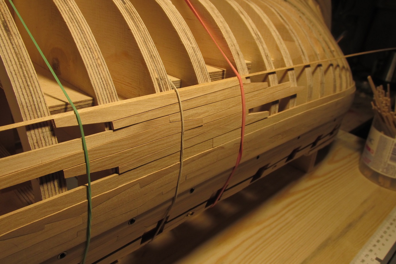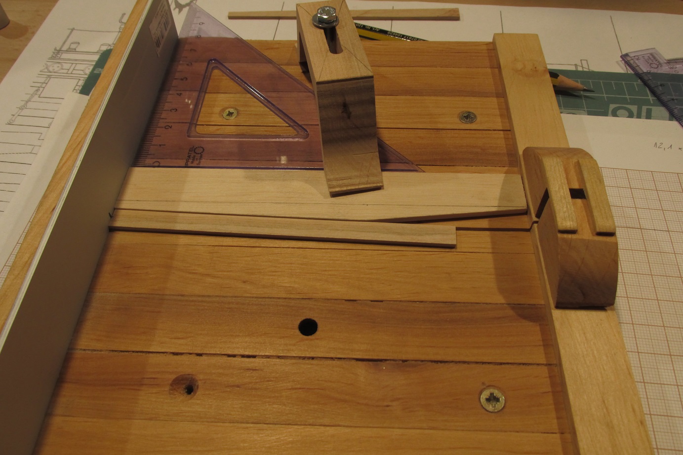 A ja się ciągle przygotowuję do poszywania dennej części burt. Wyrównałem pas odbojowy i wymyśliłem dociski, których działanie przerosło moje oczekiwania. Ich zaletą jest to że dadzą się użyć prawie w każdym miejscu poszywanego kadłuba.