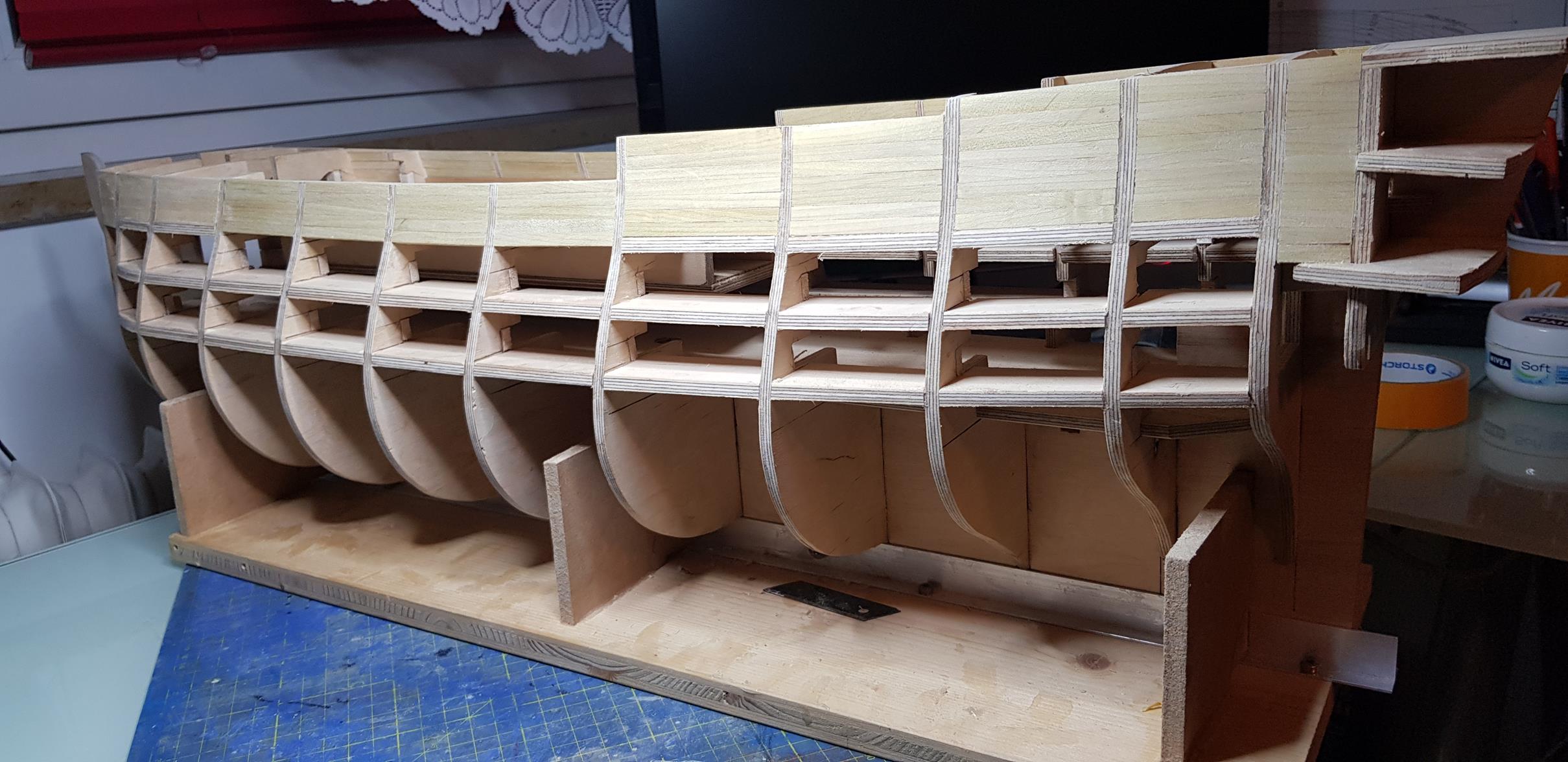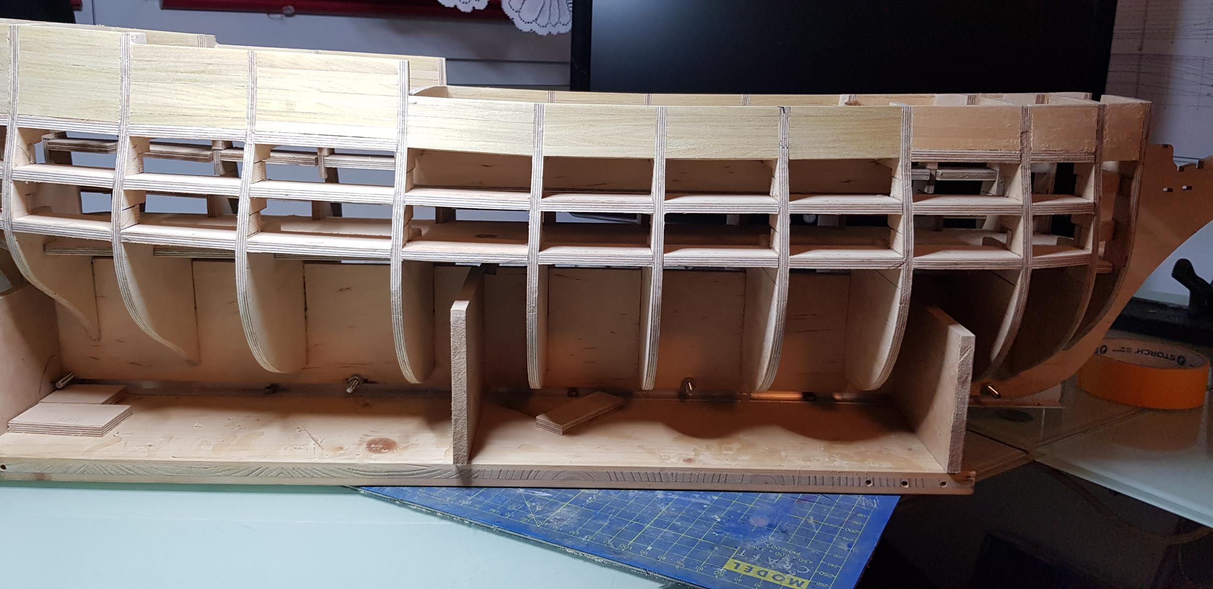A przy modelu na razie spokojnie . powstał dodatkowy kawałek podpokładu który i tak będzie zasłonięty przez greting i schody , idąc dalej według autora całe uzbrojenie miał być mocowane do listewek umiejscowionej na wysokości środka lufy . Takiego rozwiązania nie mogłem zaakceptować dlatego powstały skrawki pokładów na których w późniejszym etapie staną pełno wymiarowe lawety . Kolejnym etapem będzie wykonanie wypełnienia między wręgami , Mam nadzieje że dzięki temu uniknę problemów z późniejszym poszywaniem