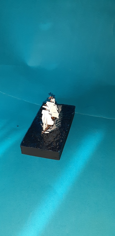 Wydaje mi się, że ciut przesadziłem z falami, model tak jak by za szybko płynął, ale zważywszy na to, że jest to pierwsza tego typu dioramka to wydaje mi się, że tragedii nie ma.