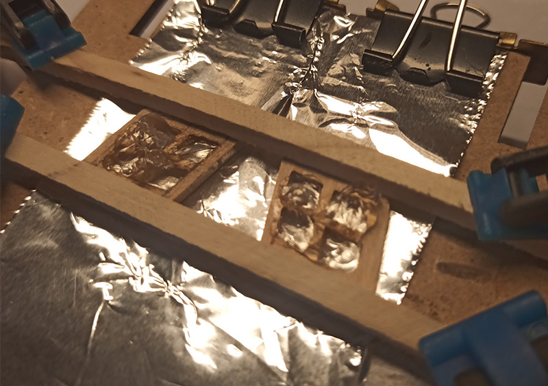Zrobiłem okienka. Uparłem się w dalszym ciągu na ten mój silikon. Zastosowałem tylko inne podejście. Stronę reprezentacyjną przycisnąłem do folii spożywczej, silikon wyciskałem bezpośrednio z tuby, po zaschnięciu tył wyrównałem skalpelem.