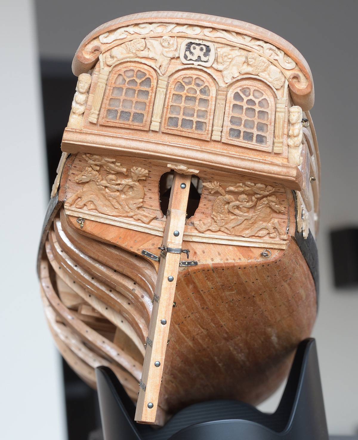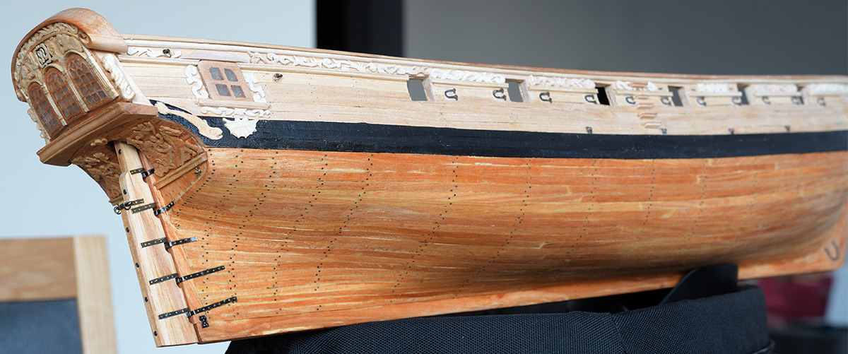 Wiele nie przybyło: zmieniłem źle przetransferowane rysunki na płaskorzeźby i poszyłem jedną burtę. Do końca nie wiedziałem czy to zrobić, a szkoda, bo przy obracaniu kadłubem trochę się popsuło. Takie decyzje lepiej podejmować na wcześniejszym etapie.