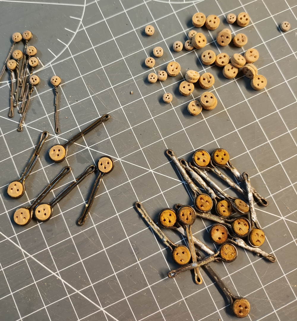 C.d. z artylerią. Porobiłem bloczki do lawet. Mają rozmiar 1.5x2x2.5mm i to jest minimum co mogę osiągnąć w swoich paluchach. Poskręcałem trochę linek, a teraz pracuję teraz nad montażem armat na pokładzie oraz falkonetami.