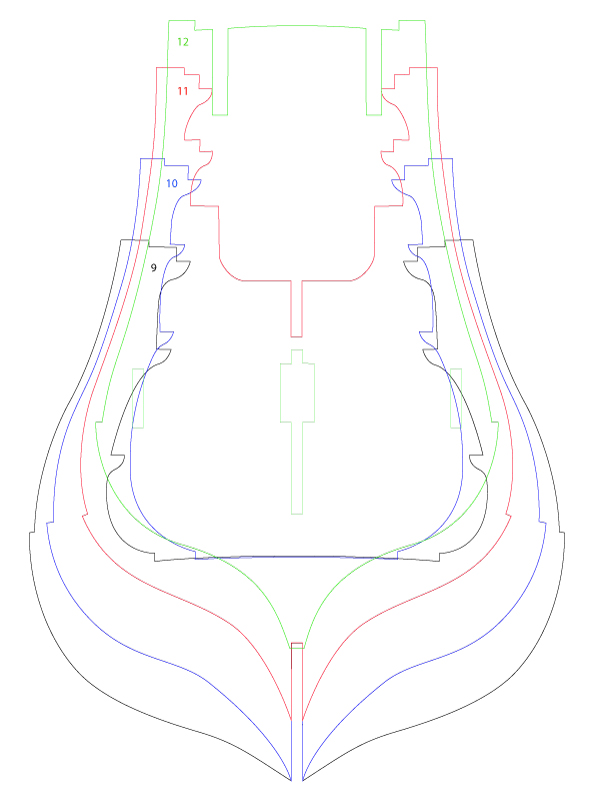 Na potrzeby mojej sekcji wykorzystam wręgi 11, 12 i 13 (pawęż z modyfikacją ażurów jak w zestawie Sergal-Mantua). Wręgę 10 będę rozrysowywał sam na podst. modelu próbnego.