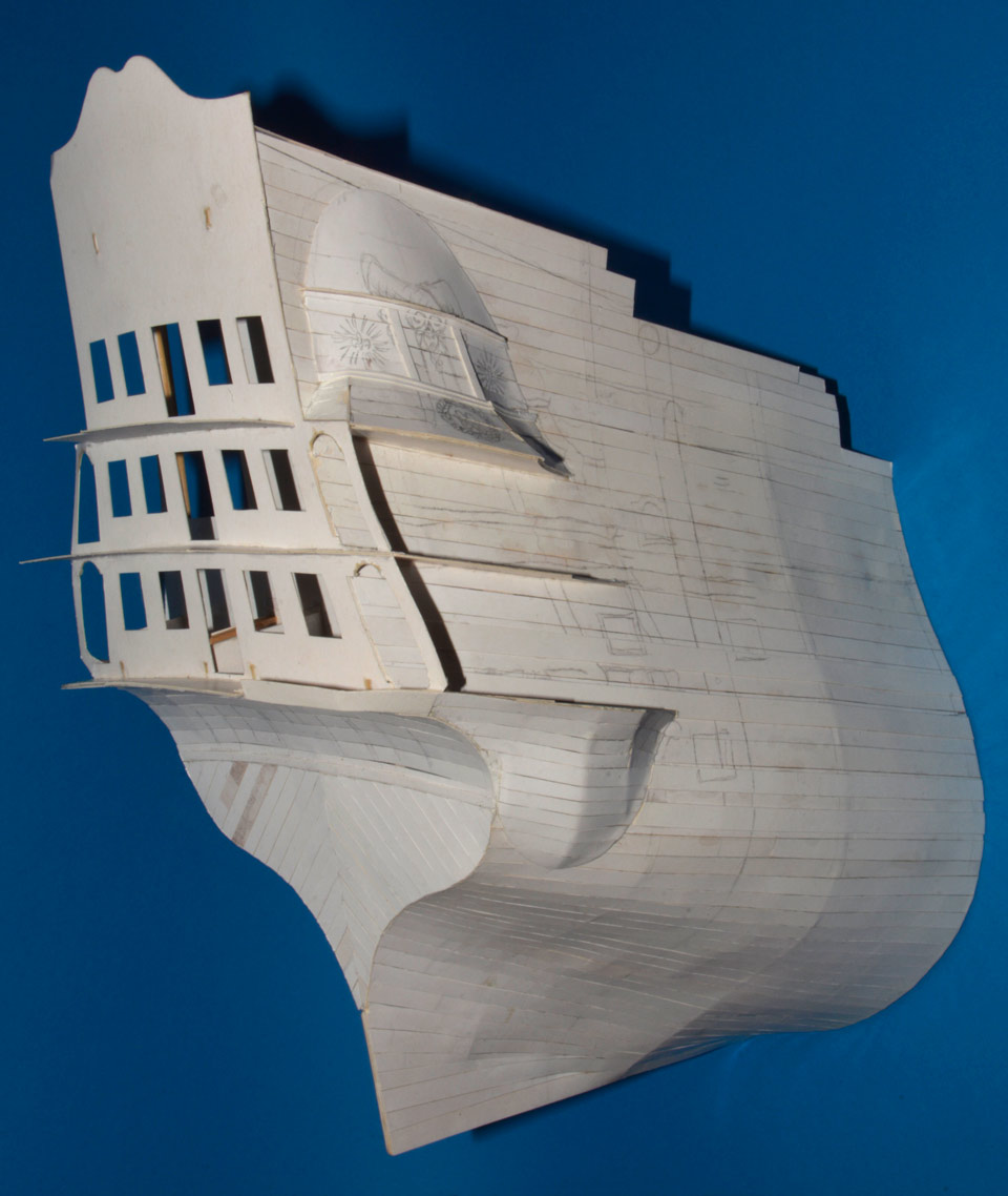 Wręgi podkleiłem listewkami, dodatkowo dla utrzymania odległości wkleiłem kartonowe dystanse, dolny pokład, dalej pokład rufówki i dolny balkon na pawęży.