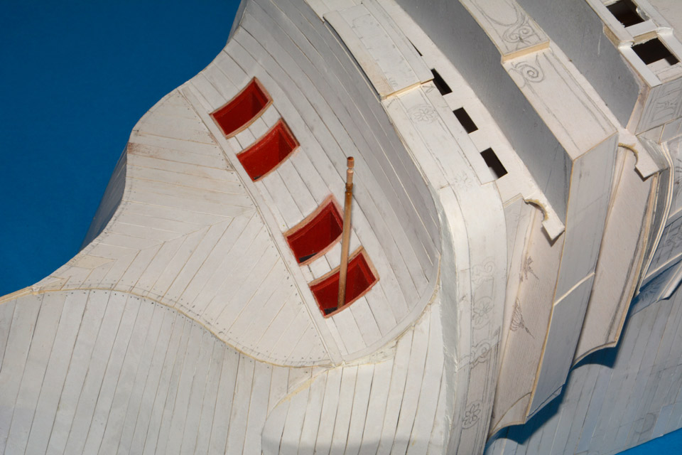 Listwy poszycia nie pokrywają się na sterburcie, gdyż tu papierowe poszycie zrobiłem błędnie - w tamtym momencie nie miała dla mnie znaczenia ich poprawność (pisałem o tym w relacji: