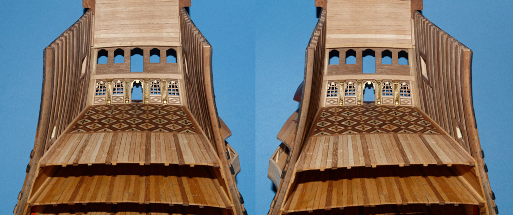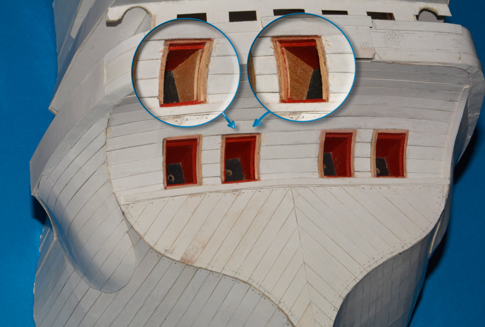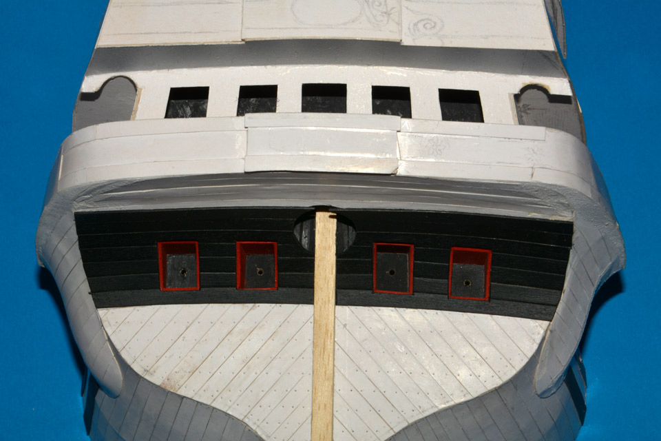 Na tym etapie planowałem jeszcze zrobić próbę kolorystyczną, czyli na czarno pomalować opaski, nawis pawęży, podpory burtowe dolnego balkonu, hełmy z nadburciami oraz lustro, a na kolor drewnopodobny resztę poszycia. Zacząłem od opasek,