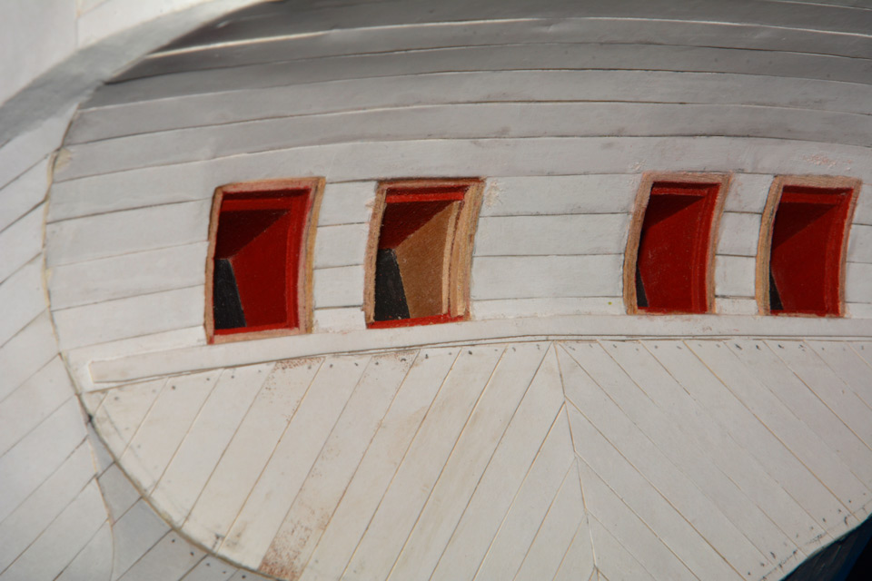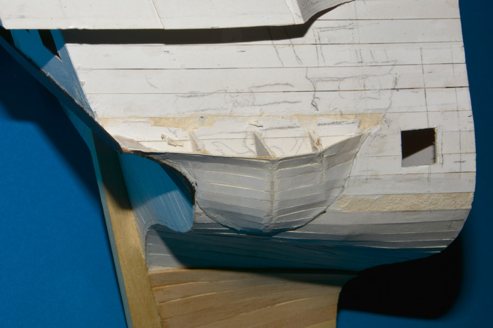 Po uzyskaniu wręgi i wyznaczeniu pokładów, ten modelik miał jedynie służyć do testów, a po wykonaniu modelu docelowego (drewnianego) miał wylądować w śmietniku. Jednak sytuacja wymusiła niejako dalszą "zabawę" z papierzakiem, włącznie z drugim bardziej poprawnym poszyciem na bakburcie uwzględniając to o czym pisałeś.