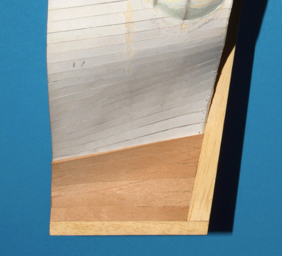 Zauwazylem tez, ze czesciowo polozone juz przez Ciebie drewniane poszycie nie pokrywa sie dokladnie z poszyciem kartonowym lezacym pod spodem - listewki drewniane maja tendencje do rozchodzenia sie na piórze rufy, zamiast lezec dokladnie na analogicznych z kartonu, lezacych pod spodem.