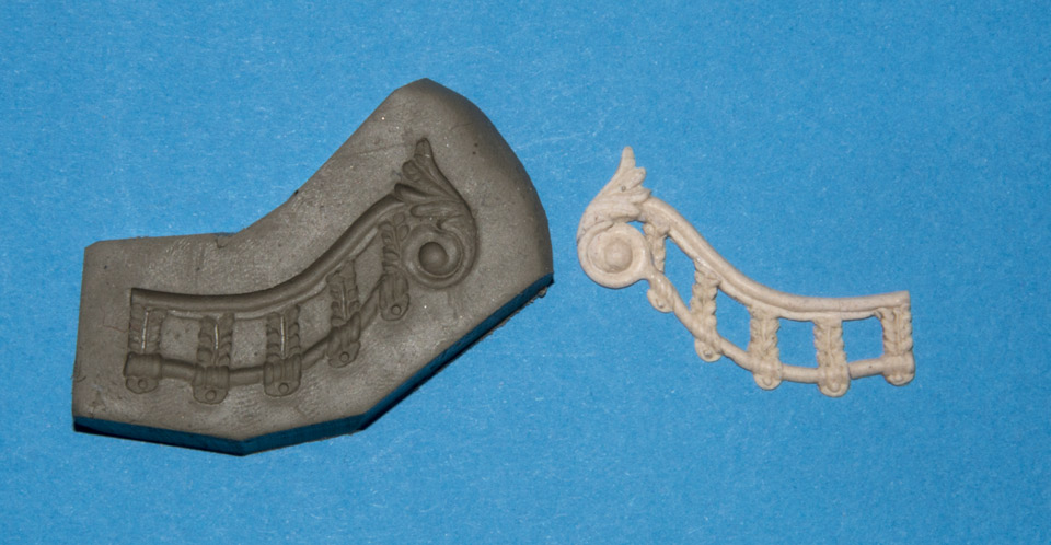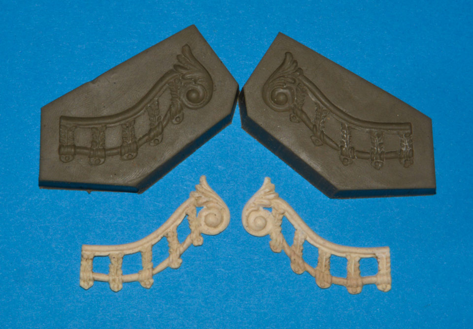 Elementy powstają również "metodą negatywową" przypomnę detal rzeźbię ("wyciskam") w plastelinie, odlewam prototyp, który "dopieszczam" do wersji końcowej, tenże odciskam w plastelinie i odlewam elementy końcowe.