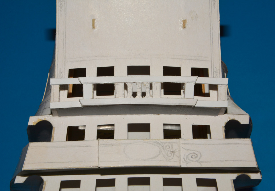 Brnę dalej, wkleiłem "barierki" dolnego balkonu. Lekkie utrudnienie w tych balkonach wynika z połączenia podstawy z "barierką" po łuku, dodatkowo w środkowym barierka łączy się z burtą tworząc kąt ostry, a w dolnym kąt rozwarty.