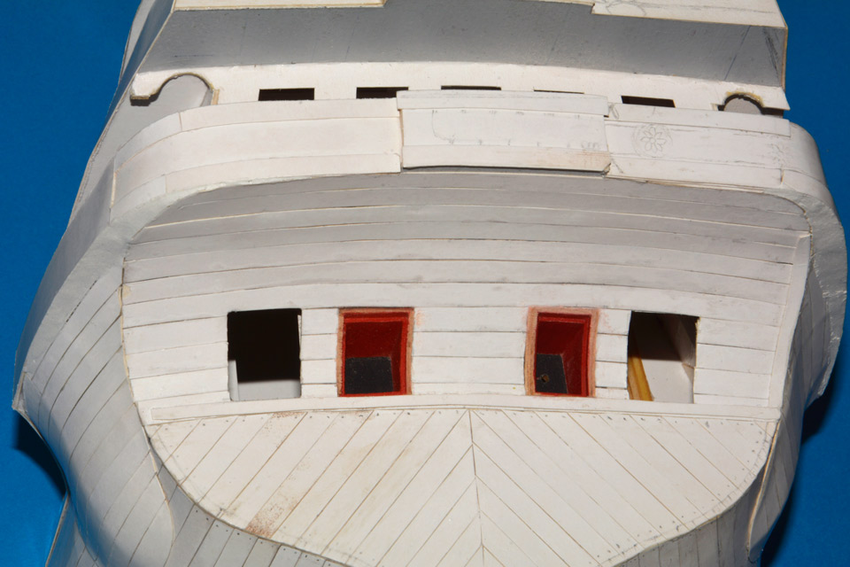 Listwy poszycia nie pokrywają się na sterburcie, gdyż tu papierowe poszycie zrobiłem błędnie - w tamtym momencie nie miała dla mnie znaczenia ich poprawność (pisałem o tym w relacji: