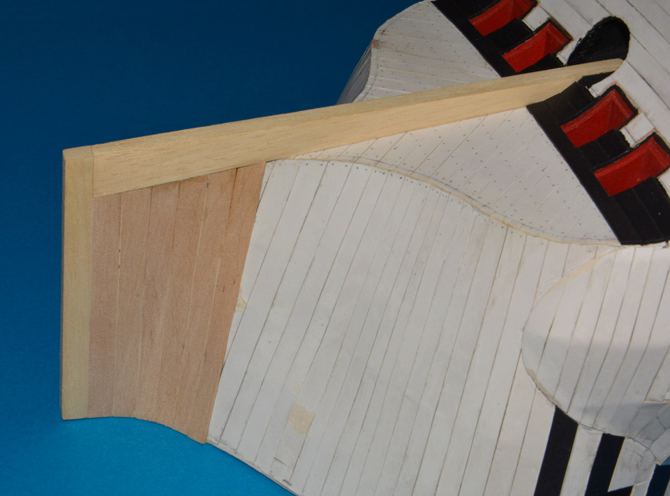 Zauwazylem tez, ze czesciowo polozone juz przez Ciebie drewniane poszycie nie pokrywa sie dokladnie z poszyciem kartonowym lezacym pod spodem - listewki drewniane maja tendencje do rozchodzenia sie na piórze rufy, zamiast lezec dokladnie na analogicznych z kartonu, lezacych pod spodem.