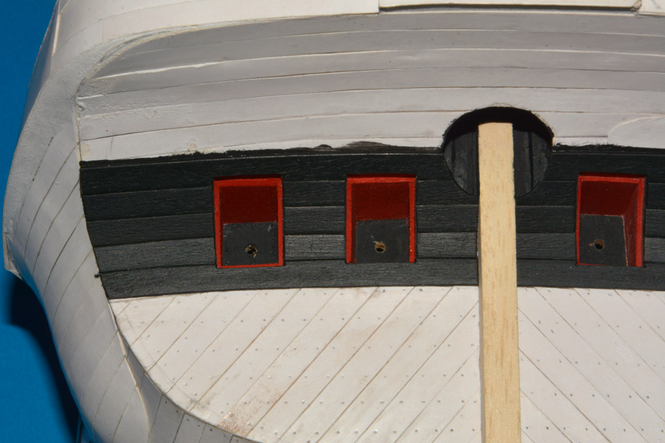 Na tym etapie planowałem jeszcze zrobić próbę kolorystyczną, czyli na czarno pomalować opaski, nawis pawęży, podpory burtowe dolnego balkonu, hełmy z nadburciami oraz lustro, a na kolor drewnopodobny resztę poszycia. Zacząłem od opasek,