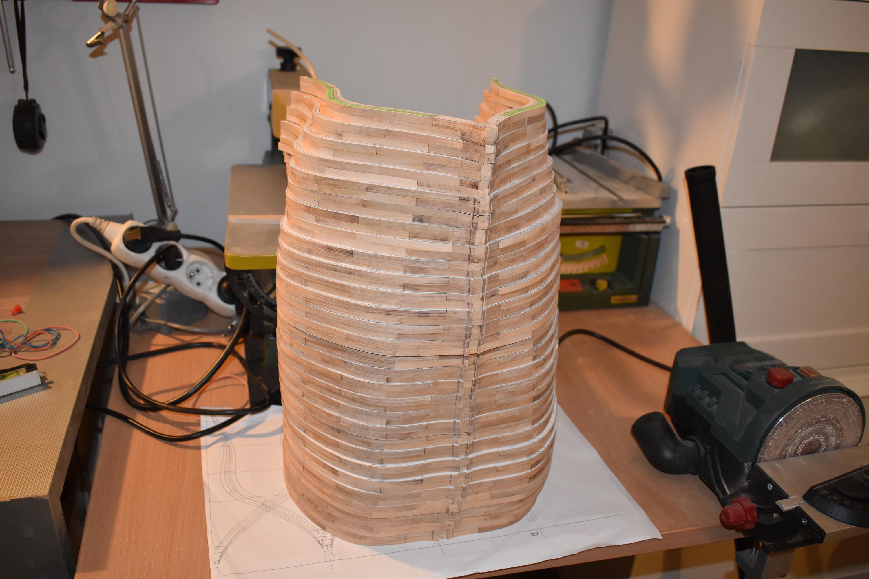 Teraz trzeba to wszystko oszlifować. Wręgi sklejałem na desce z przyklejonym planem wręgi aby być pewnym prawidłowego ułożenia poszczególnych elementów.