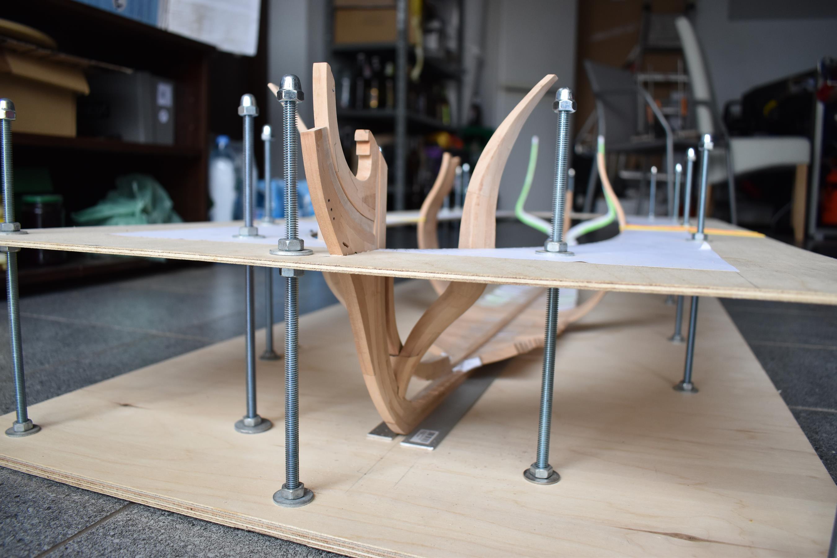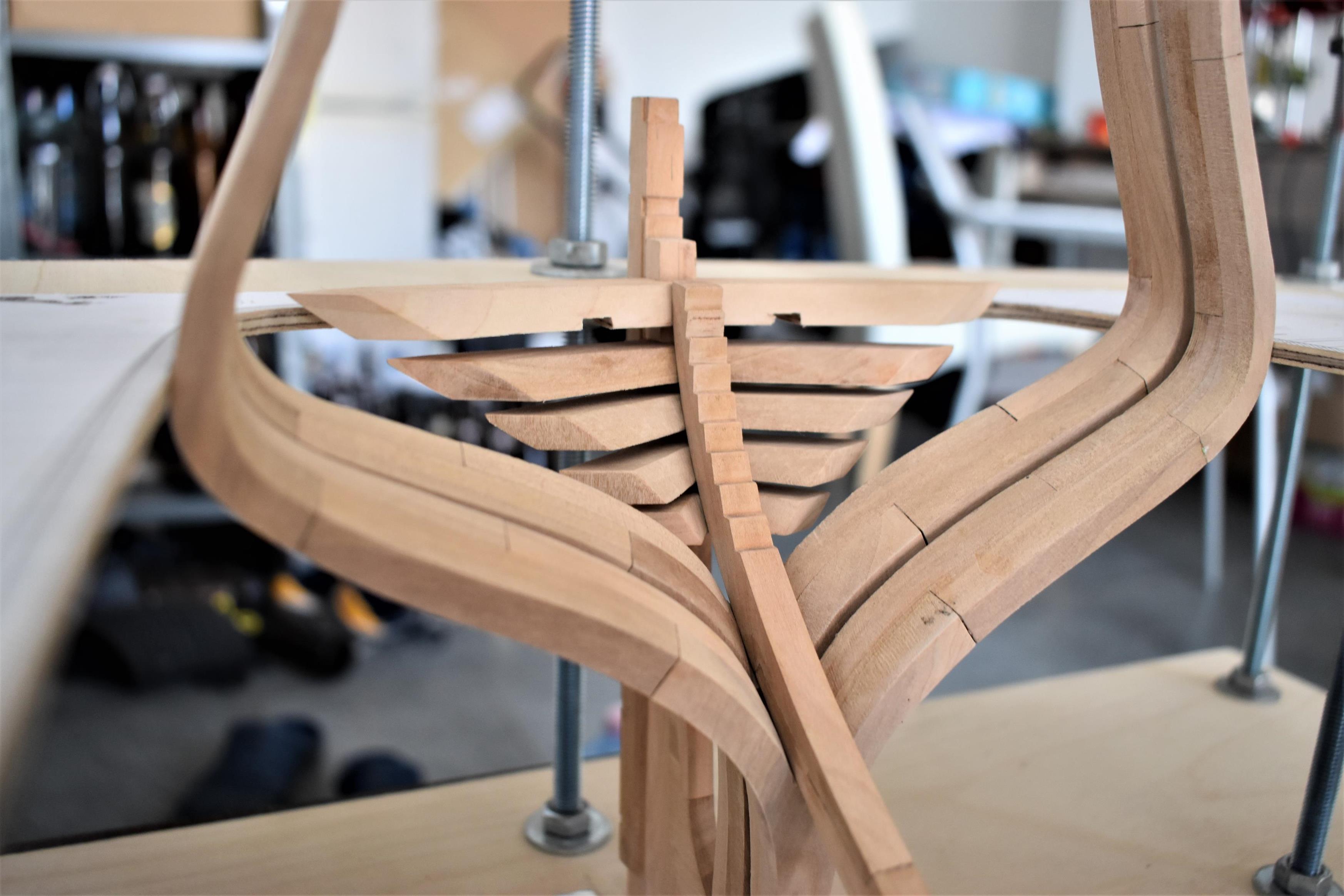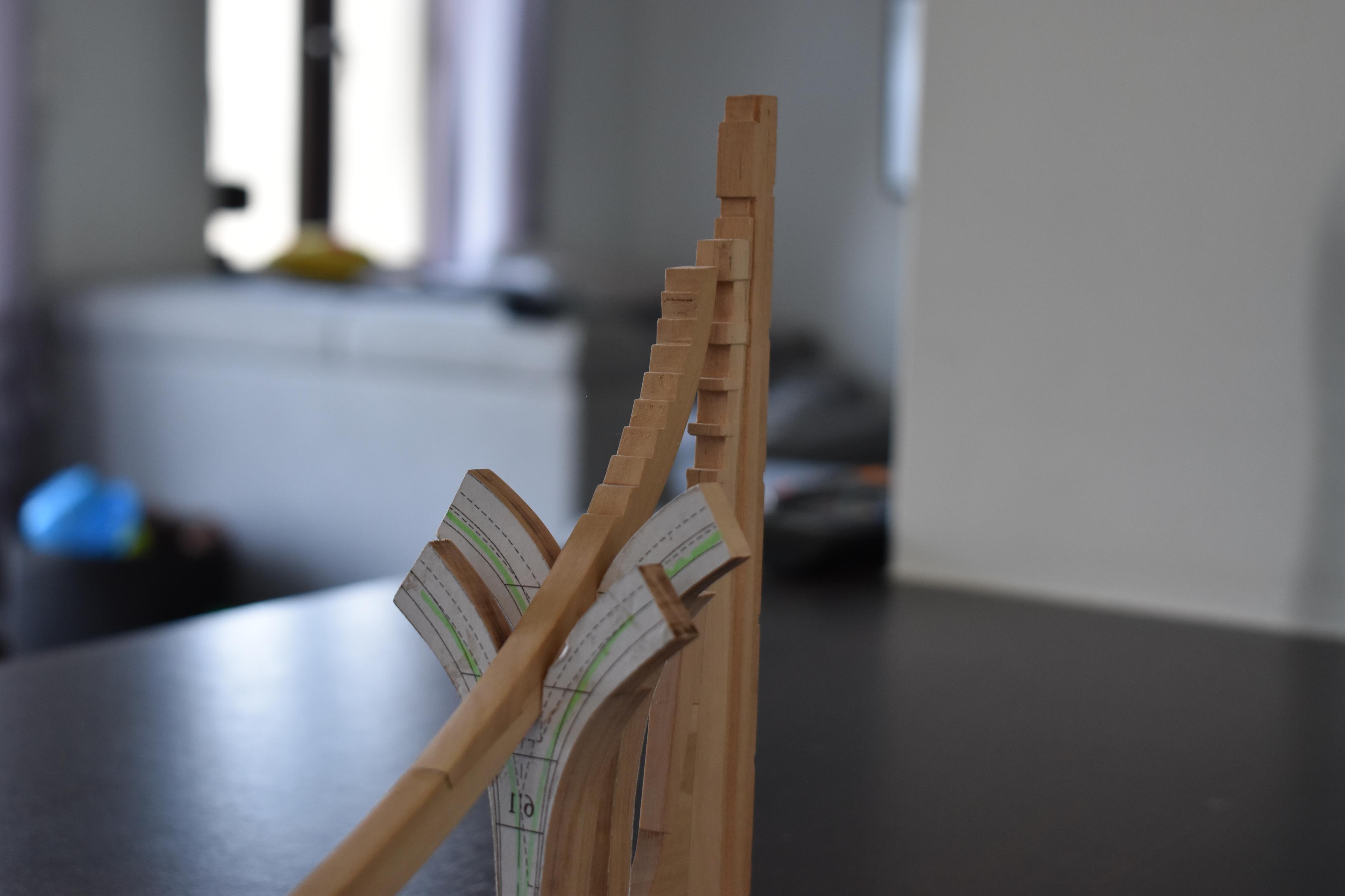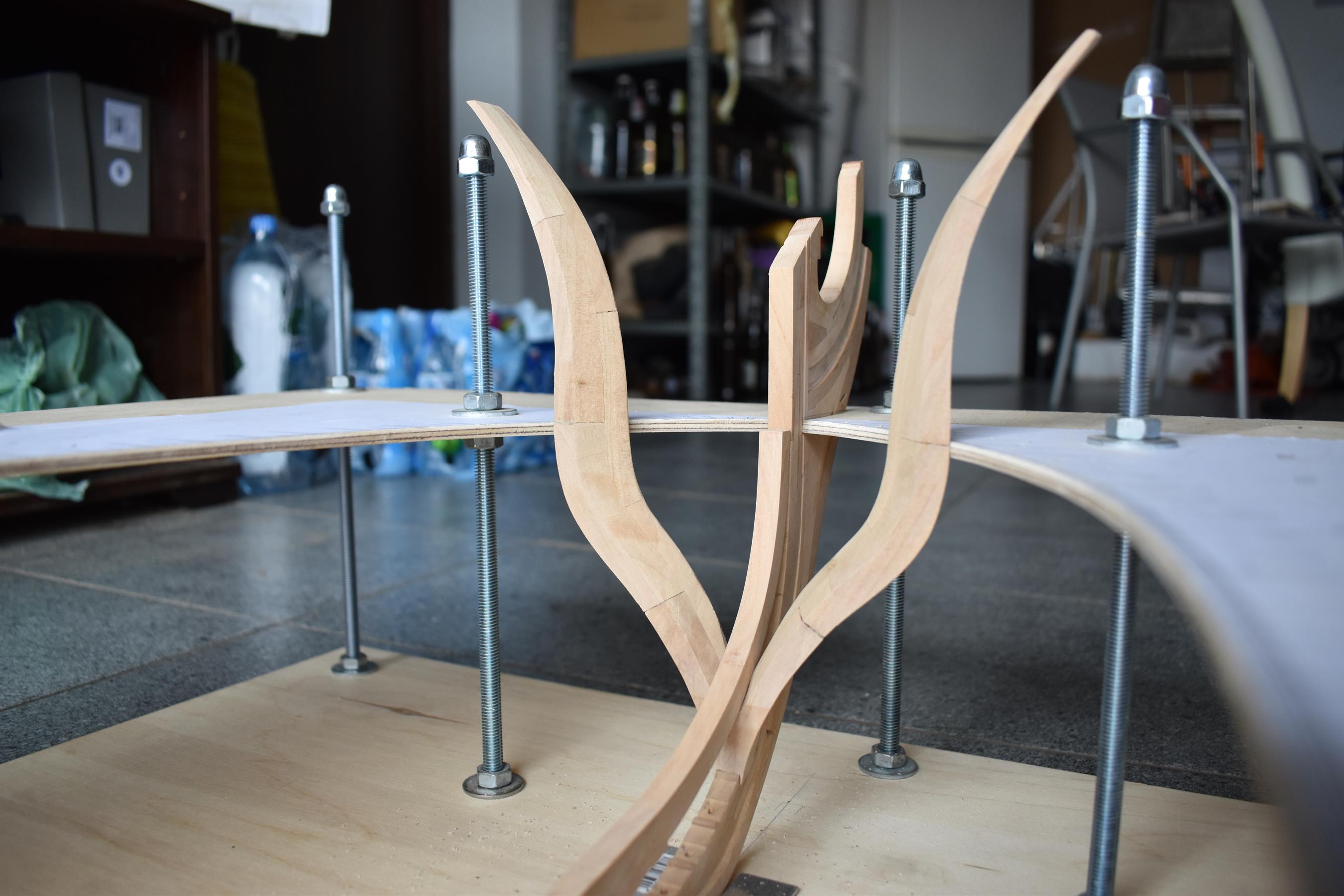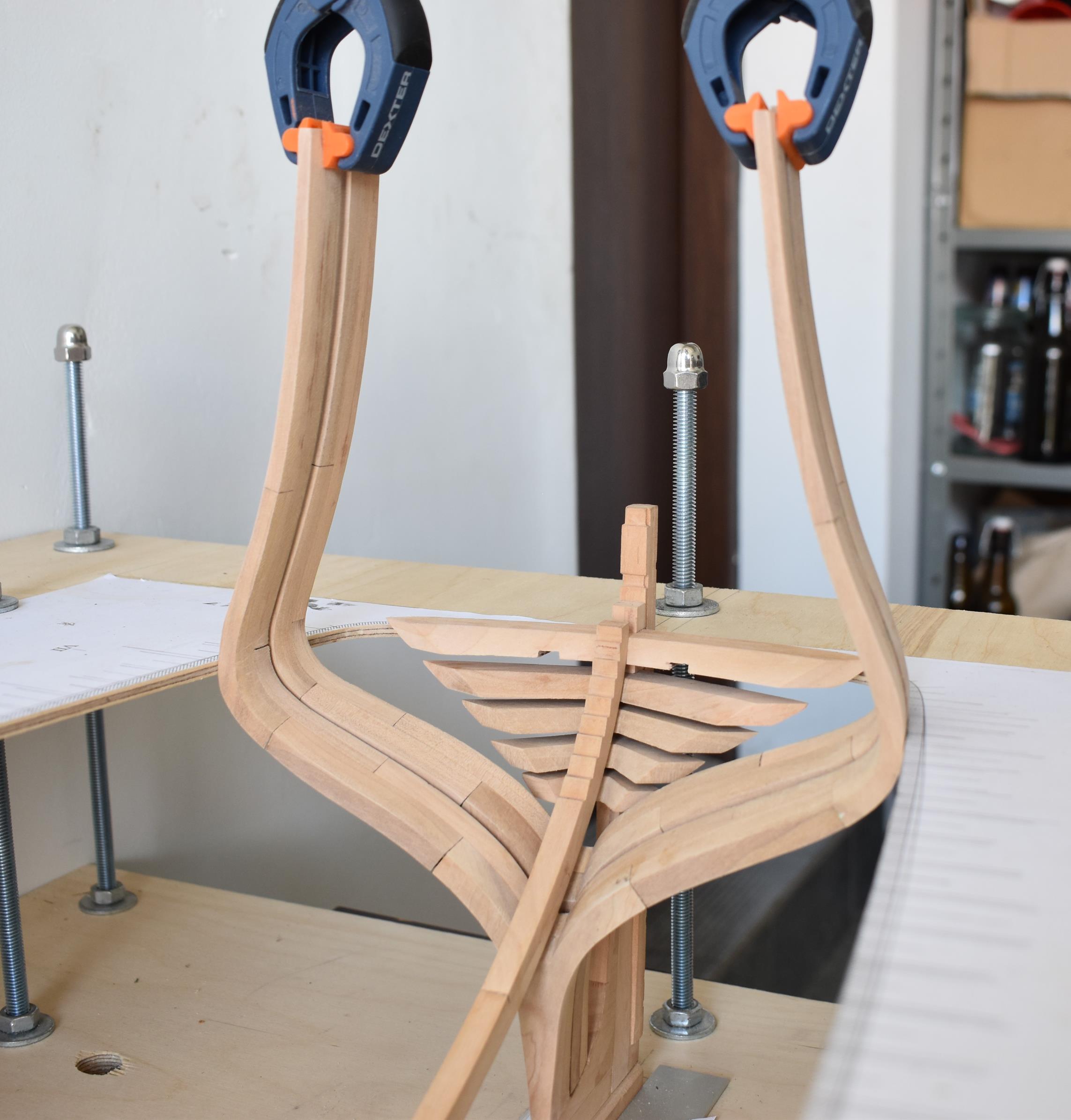 Po sklejeniu szlifuję do odpowiedniego skosu. Robię to ręcznie pilnikami. Próbowałem na maszynie, ale tak jest mi wygodniej, ponieważ mam większą kontrolę nad zbieranym materiałem. Wyszlifowaną wręgę wygładzam cyklinując ostrzem nożyka segmentowego.