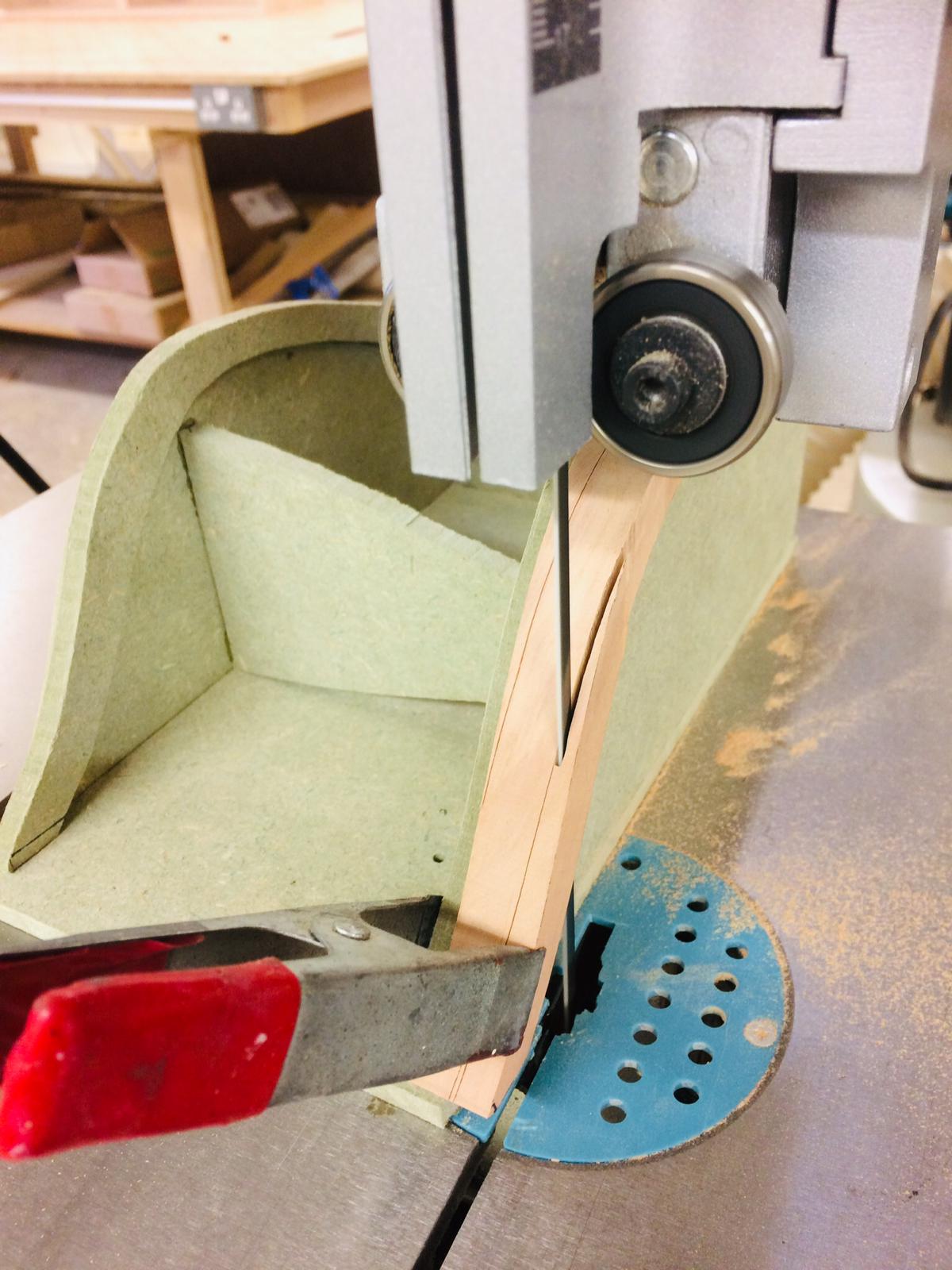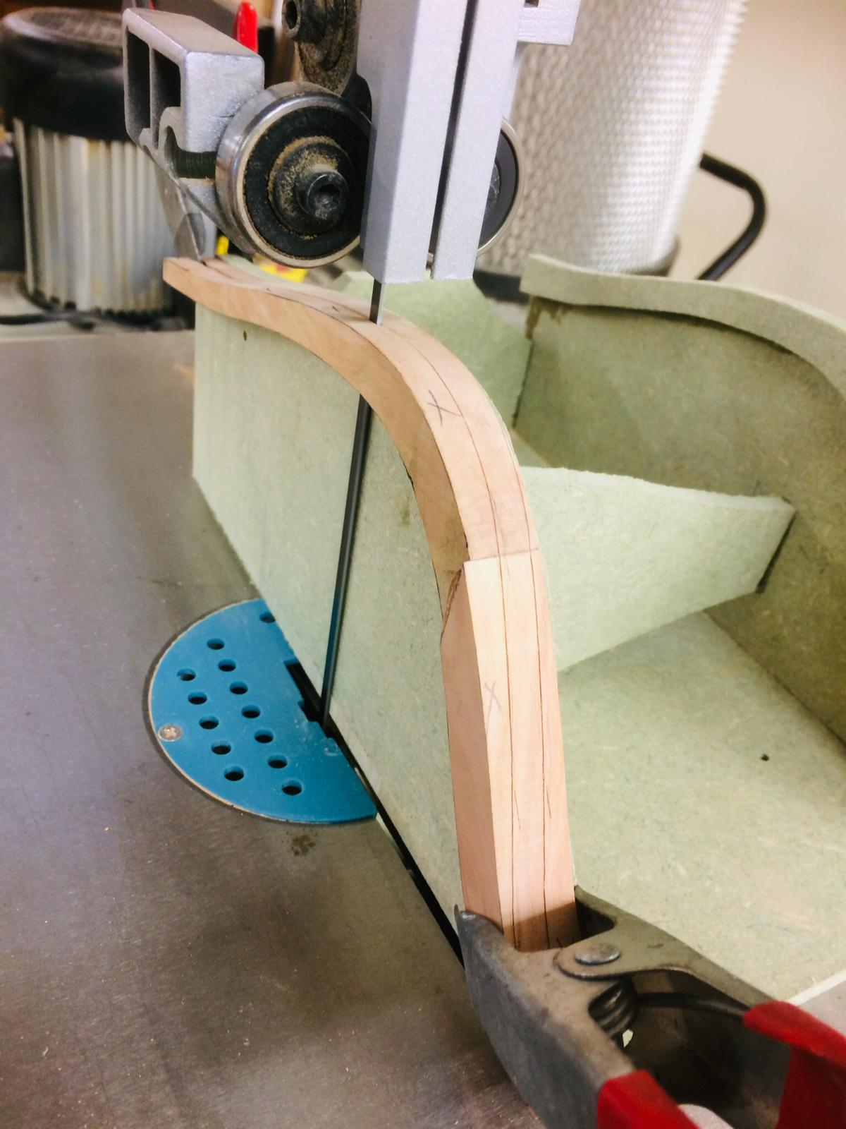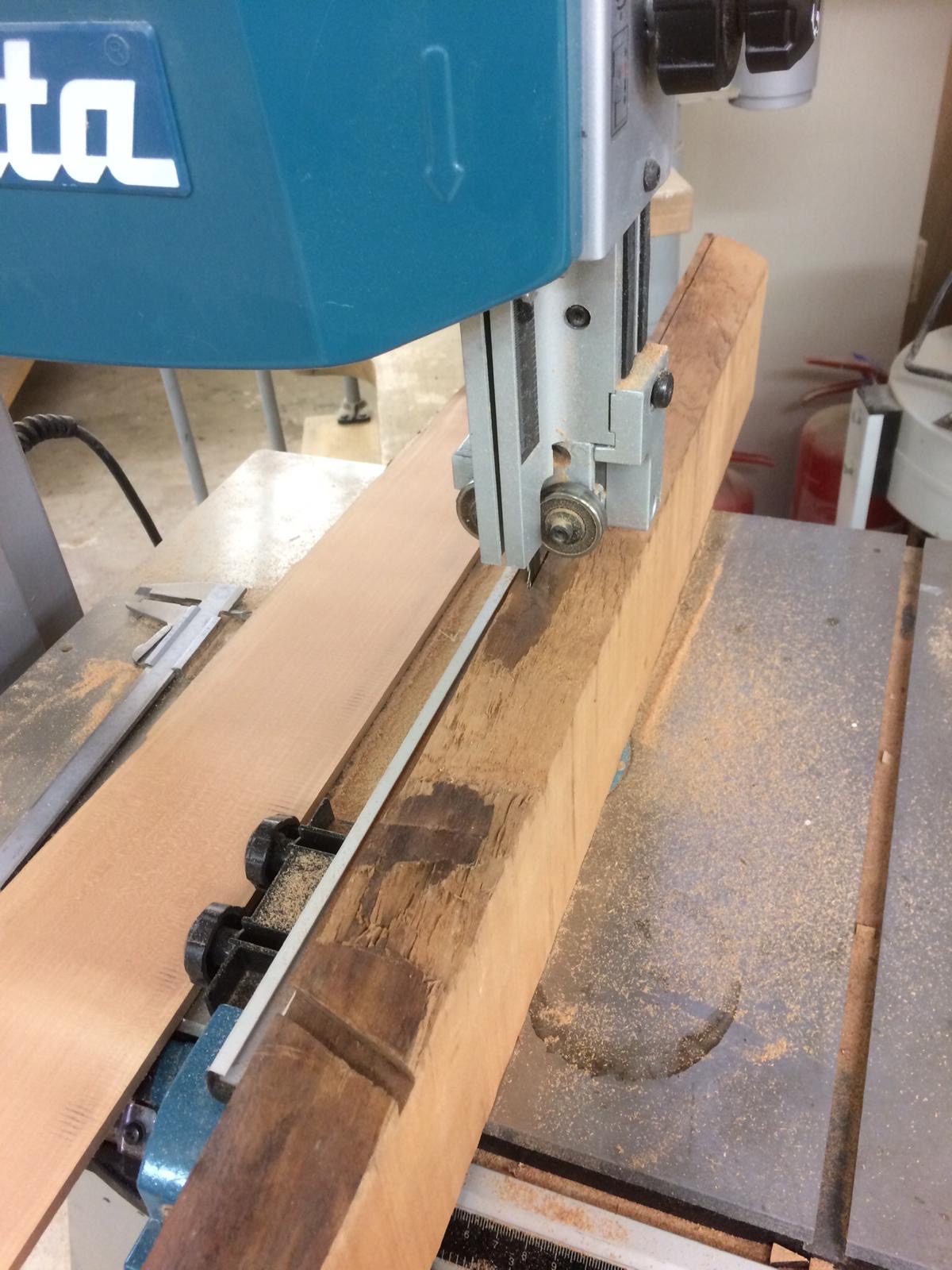 Po zrobieniu drugiej pawęży zabrałem się za przygotowanie drewna na wręgi. Do rozcięcia na potrzebne deseczki użyłem tasmówki, ponieważ daje najmniejszą stratę - ok. 1,2 mm.