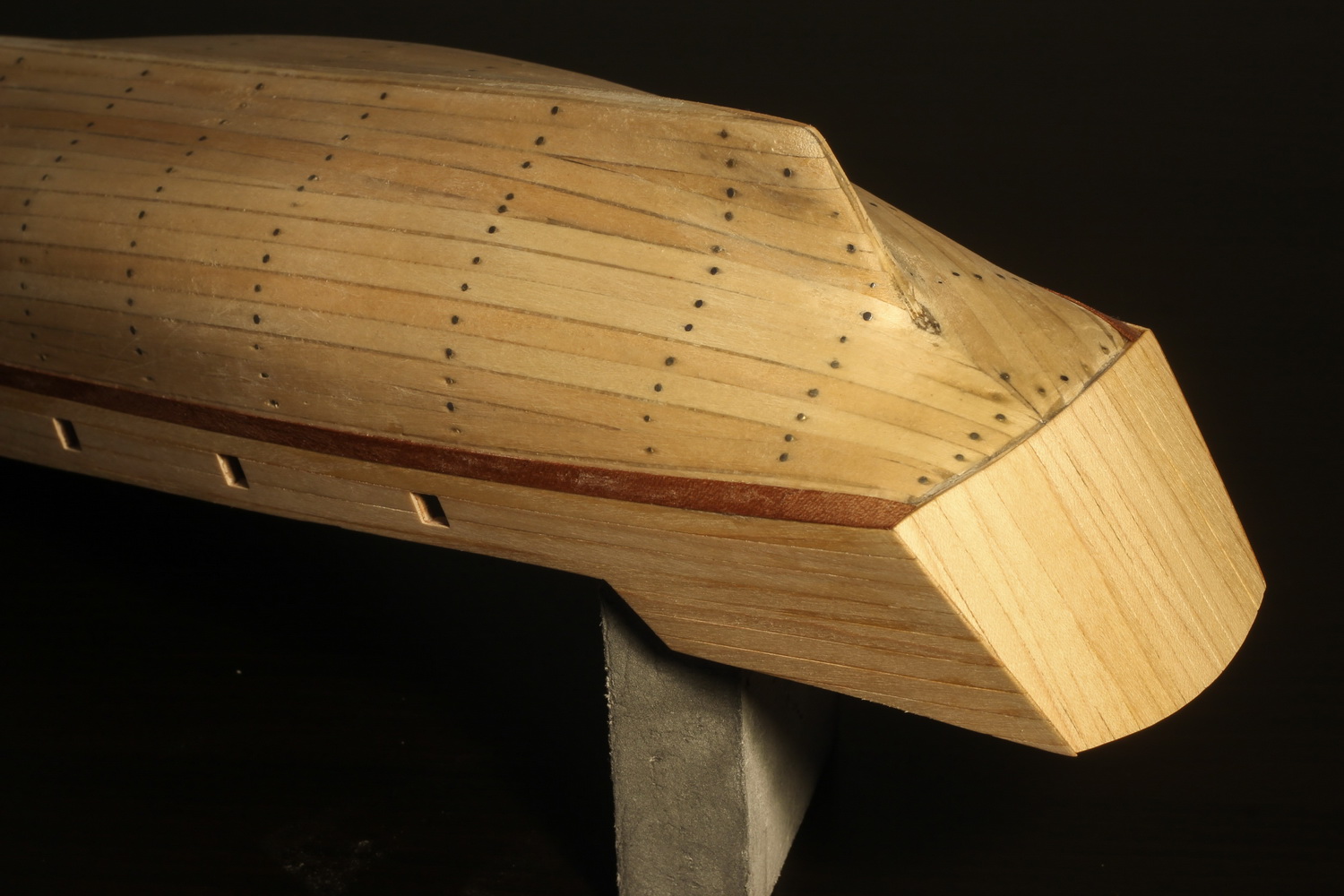 Ogolna zasada jest taka, ze kazda para planek (jedna z nich na bakburcie i druga - analogiczna dla niej - ta na sterburcie) przebiega nieprzerwanie od stewy rufowej do dziobnicy a nie tak, jak Ty zrobiles - owszem, przyklejajac niektore swoje planki nieprzerwanie od rufy do dziobnicy, ale, nie profilujac ich odpowiednio (tzw. plank spiling), uzyskales przeto zbyt waskie przestrzenie (albo brak takowych) dla kolejnych planek na dziobie. I w rezultacie zakonczyles tamte na ostry "szpikulec", nie dochodzac ich koncami do dziobnicy czy stewy rufowej, a wcisnales je miedzy sasiadujace planki.