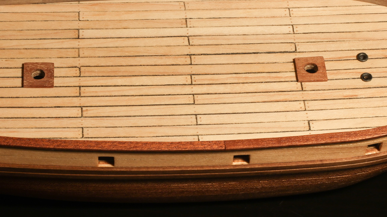 Wstrzymałem się z olejowaniem pokładu. Na pokład przyszły pomalowane okucia otworów na linę kotwiczną i wykończenia otworów masztów z mahoniowej sklejki: