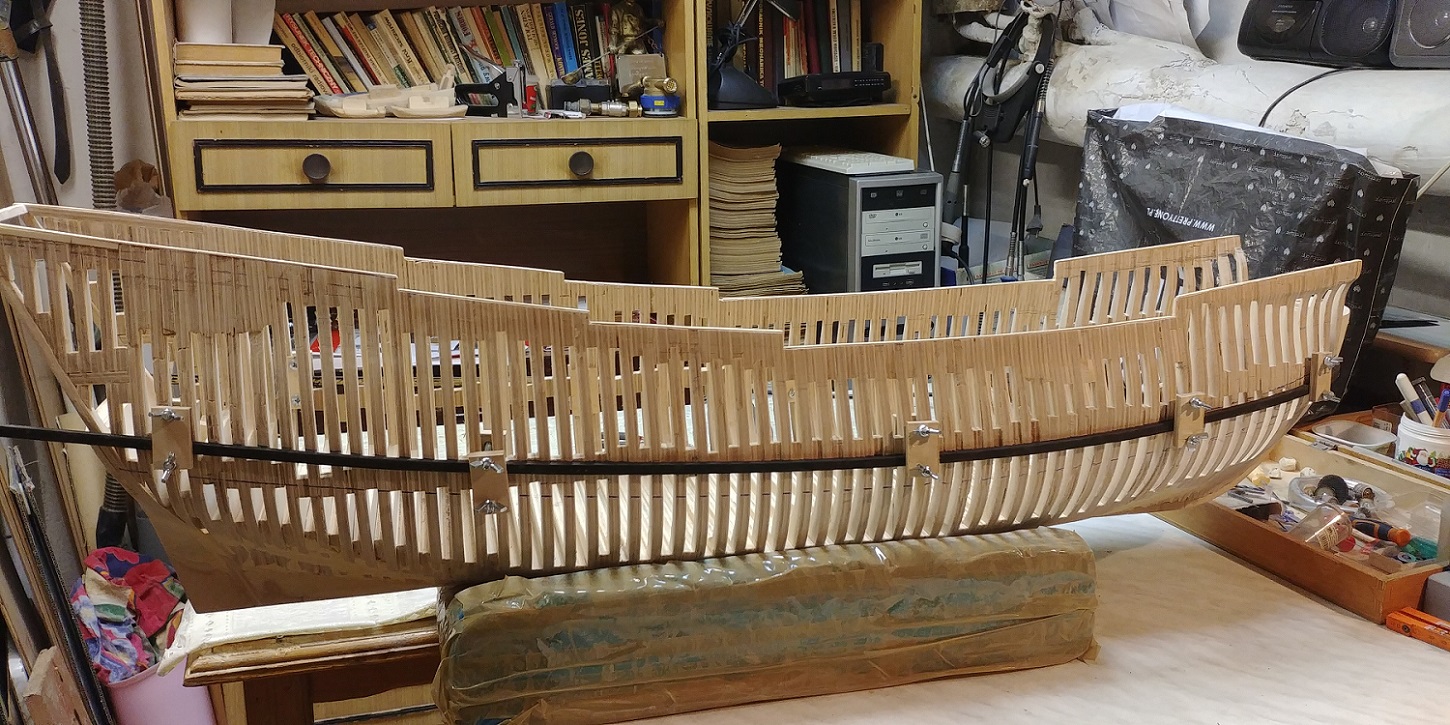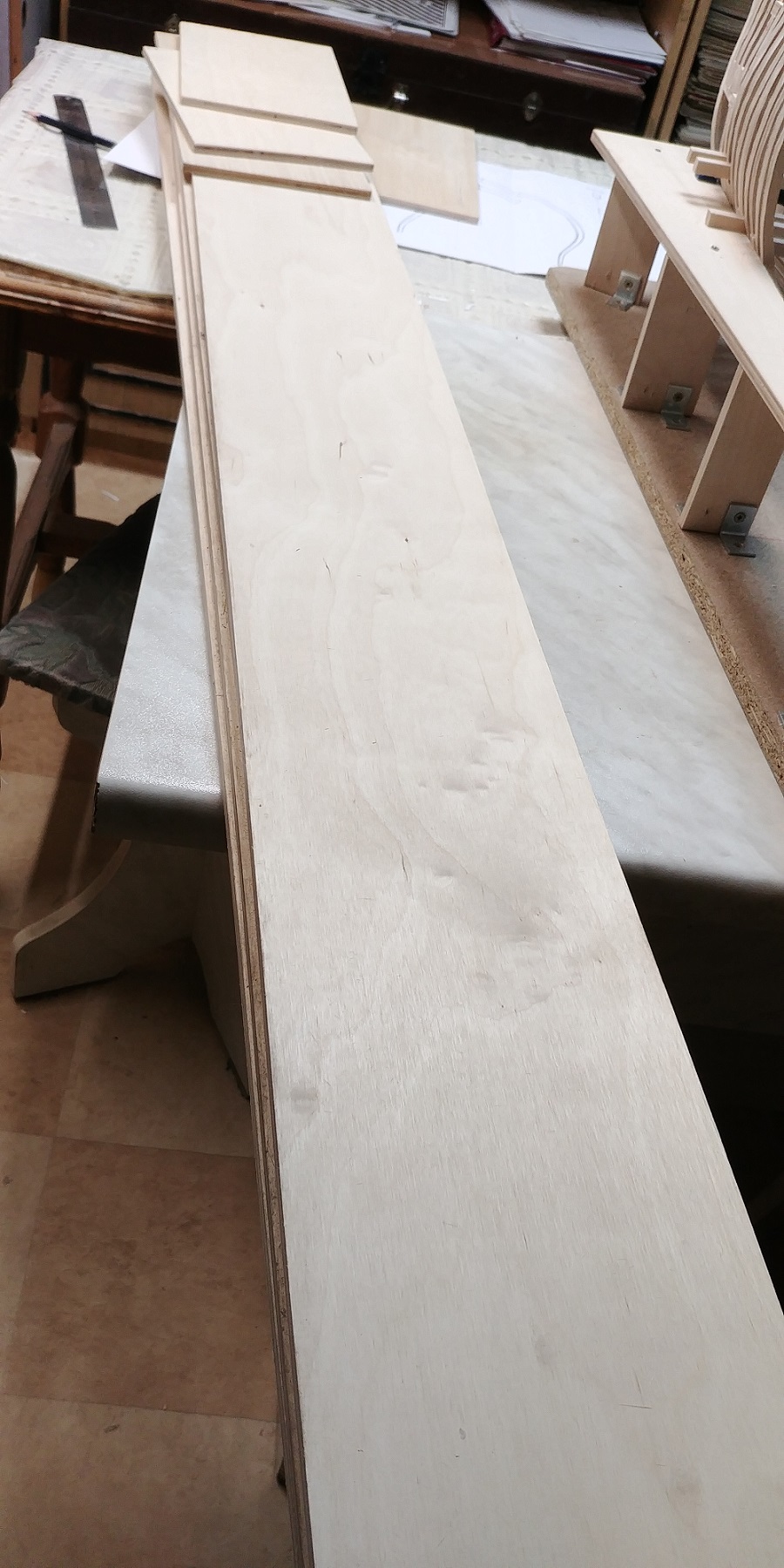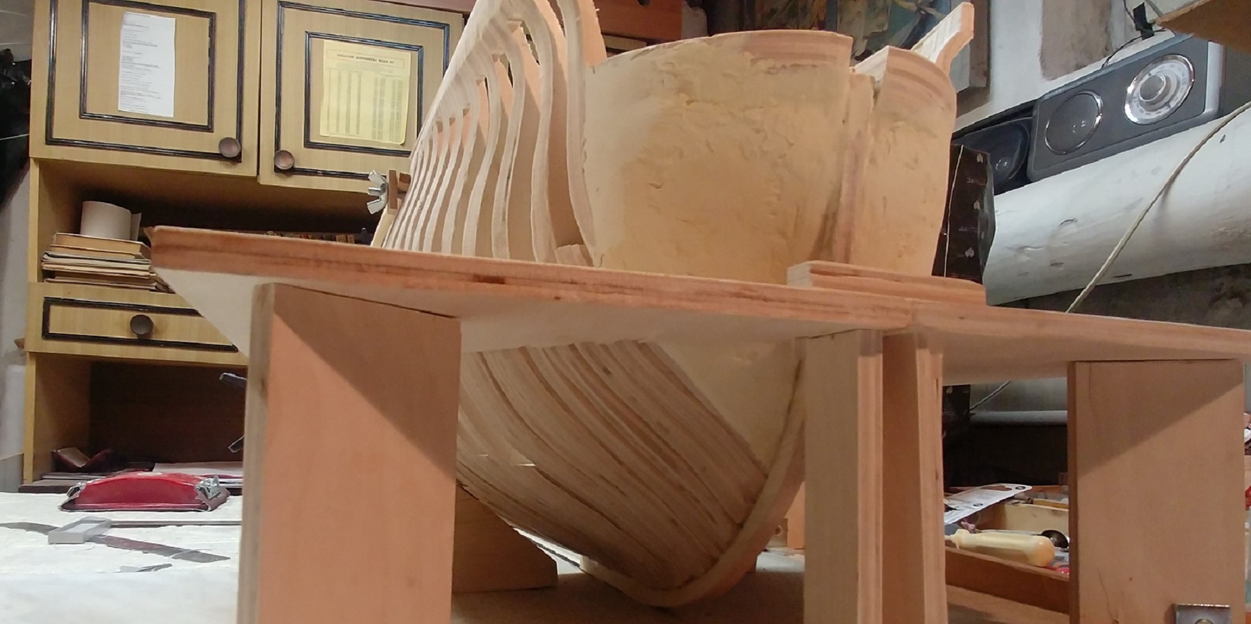 Nowy projekt i nowe wyzwanie.Szkielet sklejkowy gr.8 mm.co pasuje w/g projektu bo grubość wręg też taka sama.