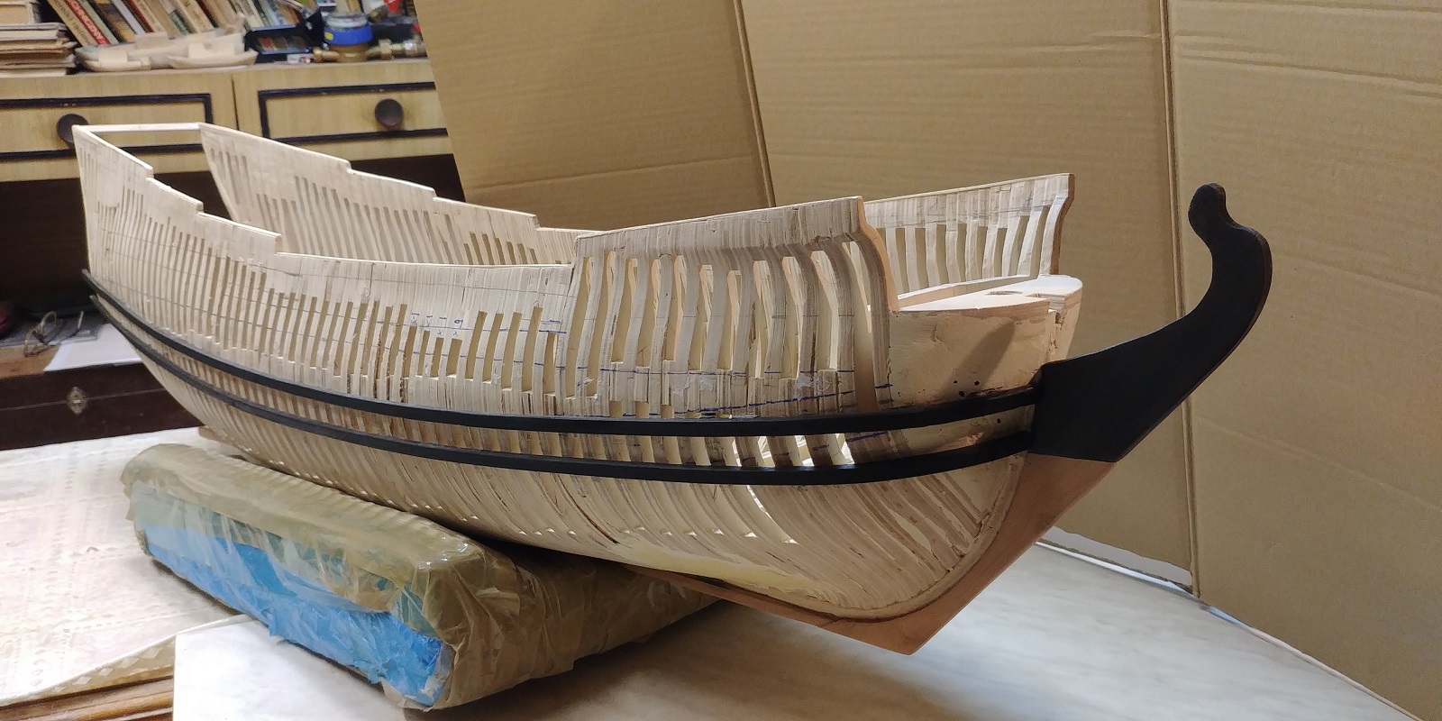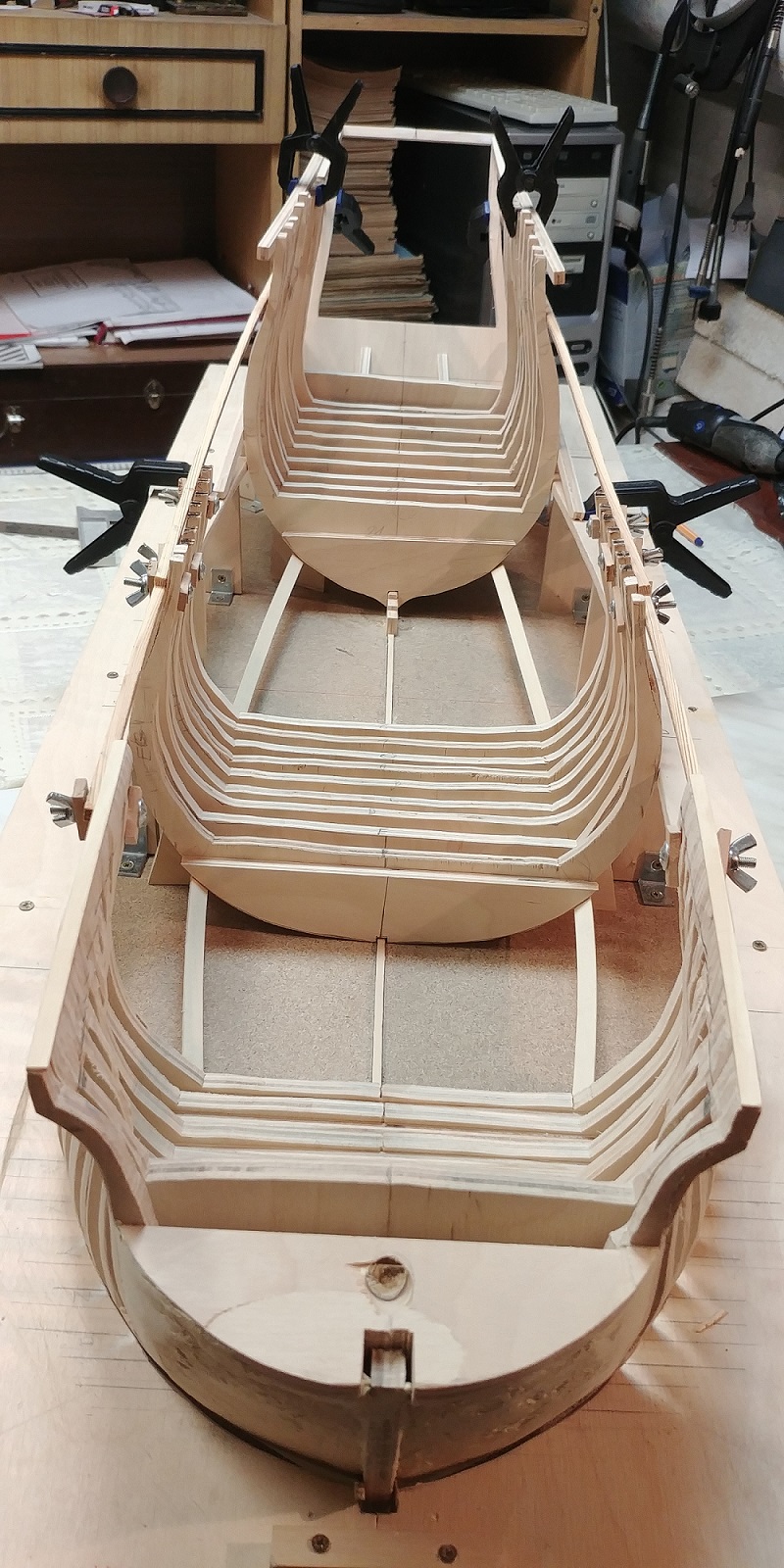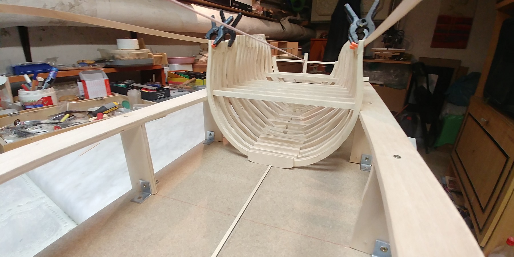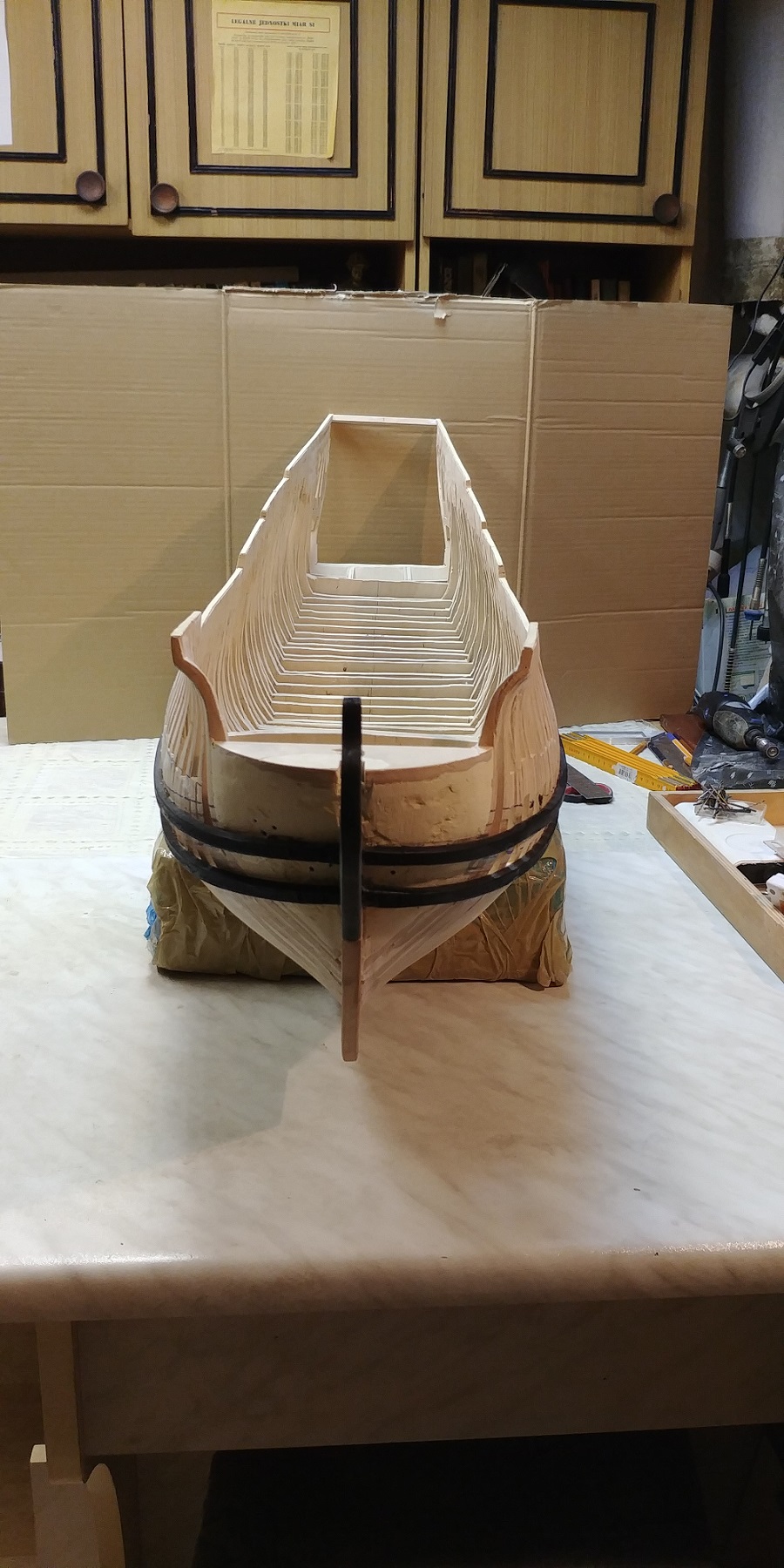 Nowy projekt i nowe wyzwanie.Szkielet sklejkowy gr.8 mm.co pasuje w/g projektu bo grubość wręg też taka sama.