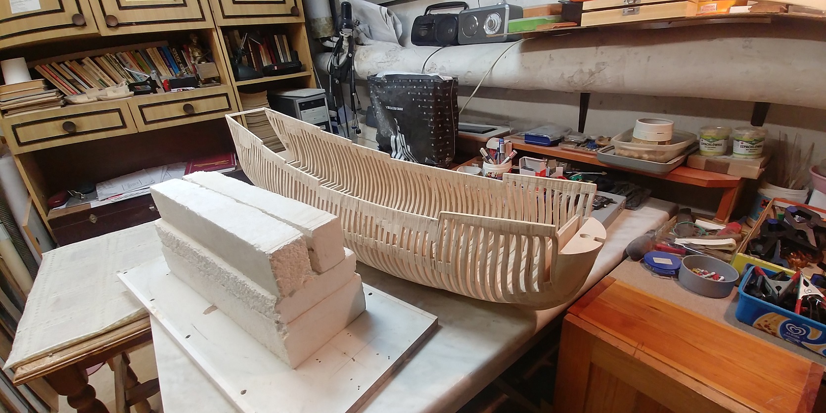 Kadłub będzie cały kryty tak,że sklejka nie przeszkadza a nawet ułatwia.Postawiłem sobie zadanie zbudowanie szkieletu.Co będzie dalej nie wiem bo to robota na lata.Model jest duży,może nawet zbyt duży jak na moje warunki lokalowe.Całe szczęście,że cięcie i pylenie jest w innym pomieszczeniu a tu tylko montaż.Życzcie mi wytrwałości.