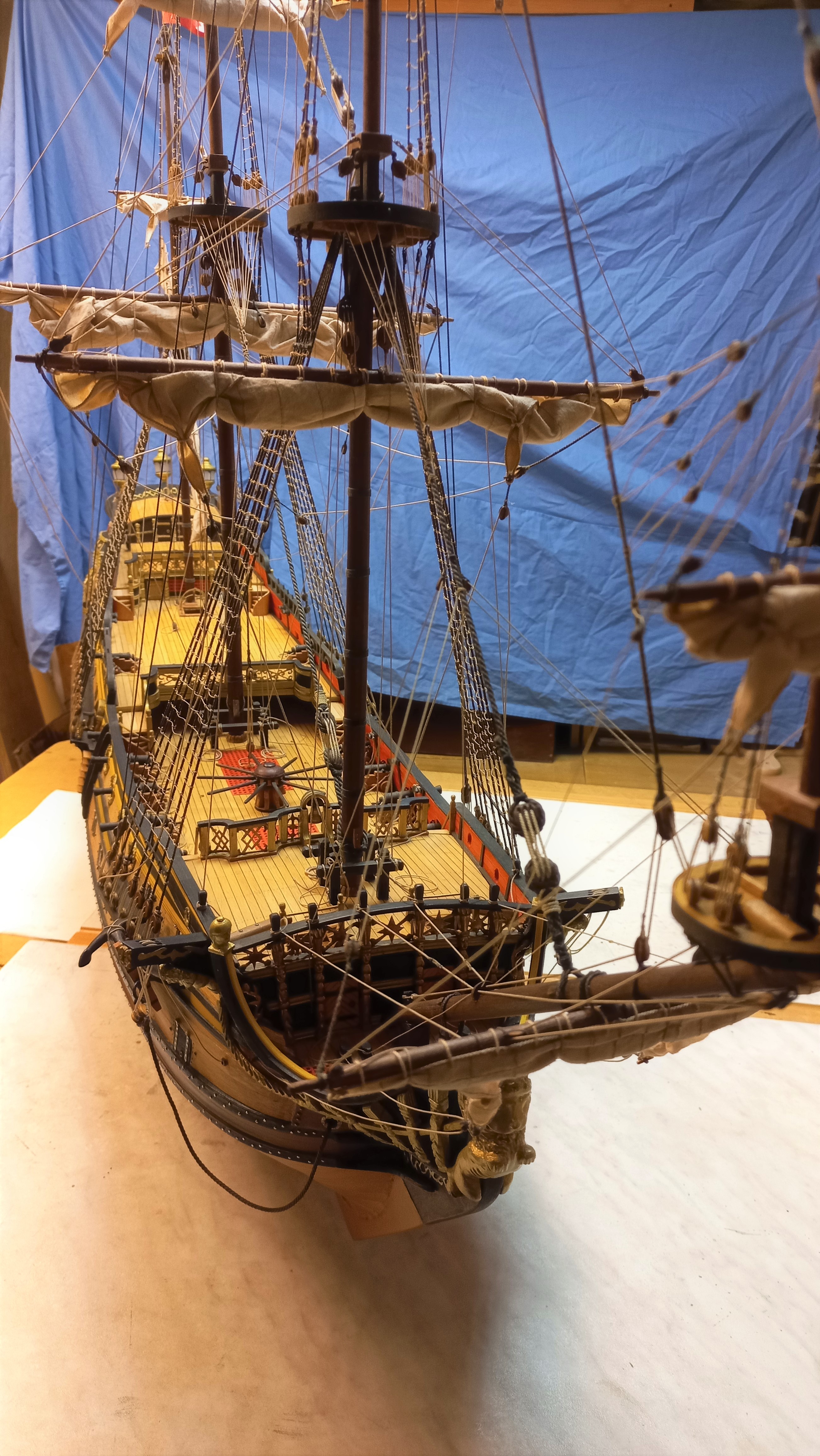 Witam.Ciąg dalszy olinowania t.zn.te najważniejsze.Jeszcze oflagowanie,podstawka jakaś fikuśna i sarkofag bo zostanie chyba na stałe tu w warsztacie.Model zbyt duży na moje skromne mieszkanie.