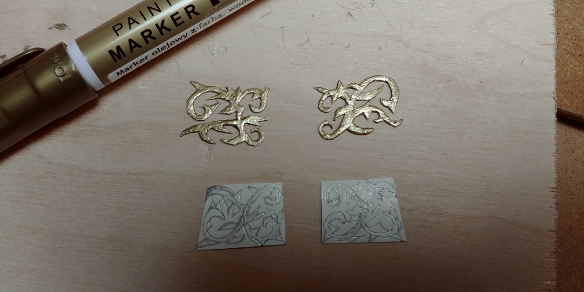 Ornamenty spod skalpela.Narysowane bohomazy po wycięciu nasączam kaponem a po wyschnięciu nakładam patyczkiem następne warstwy aż nabiorą nieco grubości.Maluję to złotym markerem i gotowe.