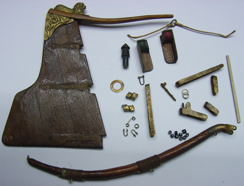 Prawie przez trzydzieści lat następowała częściowa destrukcja modelu. A oto elementy jachtu jakie zdołałem zachować do dziś, które przedstawiam na zdjęciu. Zostaną ponownie zamontowane bez jakichkolwiek zmian. Żagle po demontażu gdzieś wtryniłem i teraz nie mogę ich znaleźć. Były wykonane z błękitnego batystu. Teraz kupiłem w kolorze ecru i wykonam od nowa.