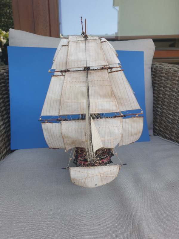 Zdezelowany model został dokurzony, do myty na ile się dało i ponownie pomalowany lakierem mat. Tylko dach nadbudówki nie będzie malowany, pozostanie taki jak jest. Linki ruchome będą też tylko częściowo wymienione. Niektóre linki stalowe [cantalowe] musiałem sztukować. Cantal jest kruchy i przy próbie zawinięcia na oczku potrafi się ukruszyć. Takie problemy miałem też przy tali jednego z baksztagów. W tamtych czasach jak był model budowany nie było takiej palety klejów jak dzisiaj. Dostępny był oprócz kleju roślinnego klej rybi i nitrocelulozowy AK20. Po tylu latach odklejają się niektóre okucia. Maszt przed montowaniem pierwszych linek wzmocniłem tymczasowymi łupkami, które finalnie będą zdjęte. Jako pierwsze linki zostały zamontowane baksztagi i sztagi sztaksli. Zdjęcia poniżej: