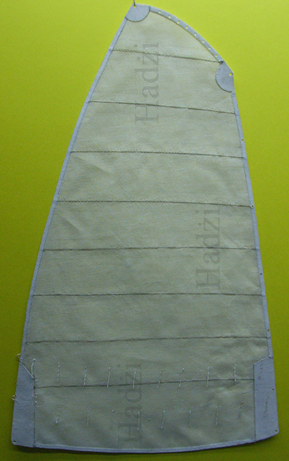 Ja na żagle zakupiłem materiał Batyst w kolorze ecru [ekri] i nie będzie niczym barwiony. Barwienie czysto białego materiału w herbacie jest od dawna znane modelarzom. Batyst jest jednym z najcieńszych materiałów. Cieńszym, a właściwie mniej gęstszym materiałem od Batystu jest Etamina. Do usztywniania materiału stosuję usztywniaczy dostępnych w handlu. Są to usztywniacze odwracalne. Usztywnienie klejowe mam zamiar zastosować w fazie końcowej, podczas kształtowania wybrzuszeń. Rysowanie brytów ołówkiem jest uproszczeniem. Podczas przeszywania materiał się marszczy gdy stopka maszyny wywiera zbyt duży nacisk na transporter. Nie mam problemu z szyciem tylko z utrzymaniem równej linii szycia. W krawiectwie , to nie jest problem, ale modelarstwie tak. U mnie grotżagiel ma usztywnienia wszystkich lików i rogów. Usztywnienia będą miały 2 mm szerokości i będą obustronnie klejone klejem do tkanin.