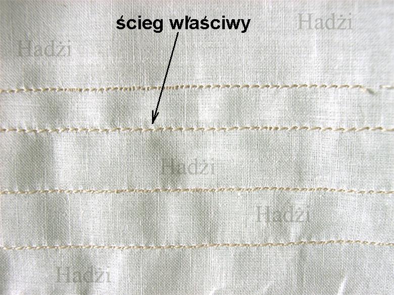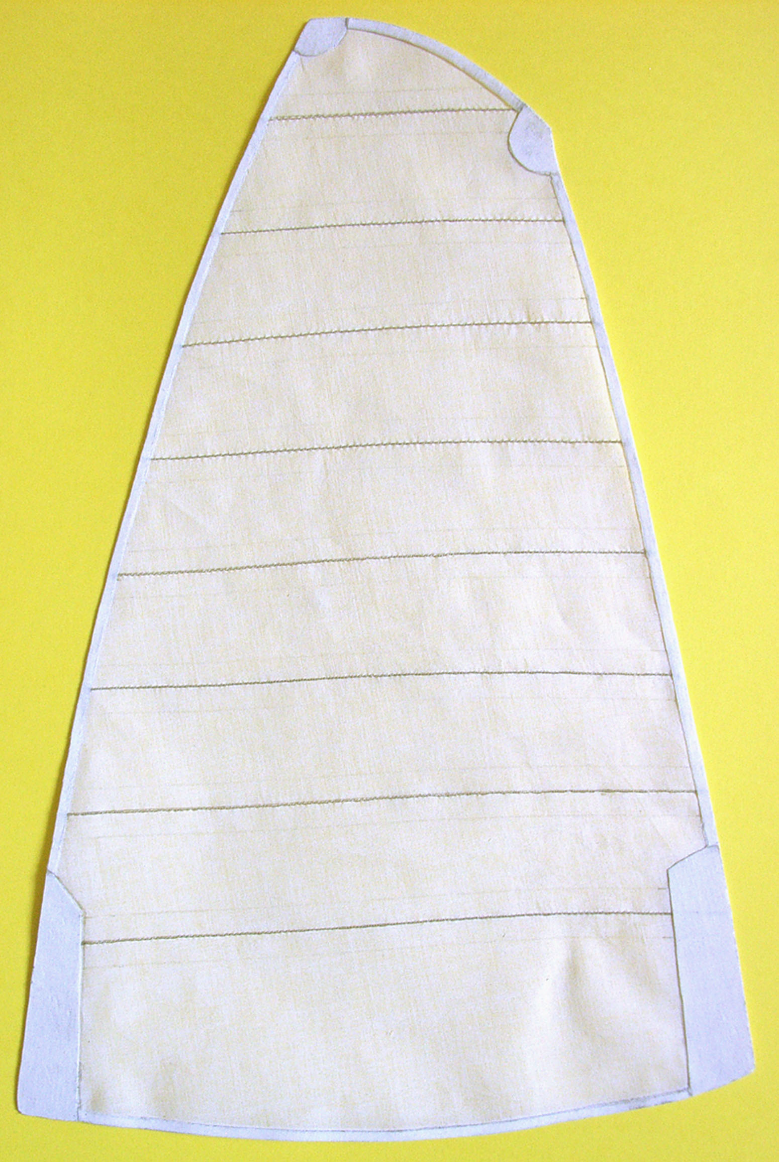 Ja na żagle zakupiłem materiał Batyst w kolorze ecru [ekri] i nie będzie niczym barwiony. Barwienie czysto białego materiału w herbacie jest od dawna znane modelarzom. Batyst jest jednym z najcieńszych materiałów. Cieńszym, a właściwie mniej gęstszym materiałem od Batystu jest Etamina. Do usztywniania materiału stosuję usztywniaczy dostępnych w handlu. Są to usztywniacze odwracalne. Usztywnienie klejowe mam zamiar zastosować w fazie końcowej, podczas kształtowania wybrzuszeń. Rysowanie brytów ołówkiem jest uproszczeniem. Podczas przeszywania materiał się marszczy gdy stopka maszyny wywiera zbyt duży nacisk na transporter. Nie mam problemu z szyciem tylko z utrzymaniem równej linii szycia. W krawiectwie , to nie jest problem, ale modelarstwie tak. U mnie grotżagiel ma usztywnienia wszystkich lików i rogów. Usztywnienia będą miały 2 mm szerokości i będą obustronnie klejone klejem do tkanin.