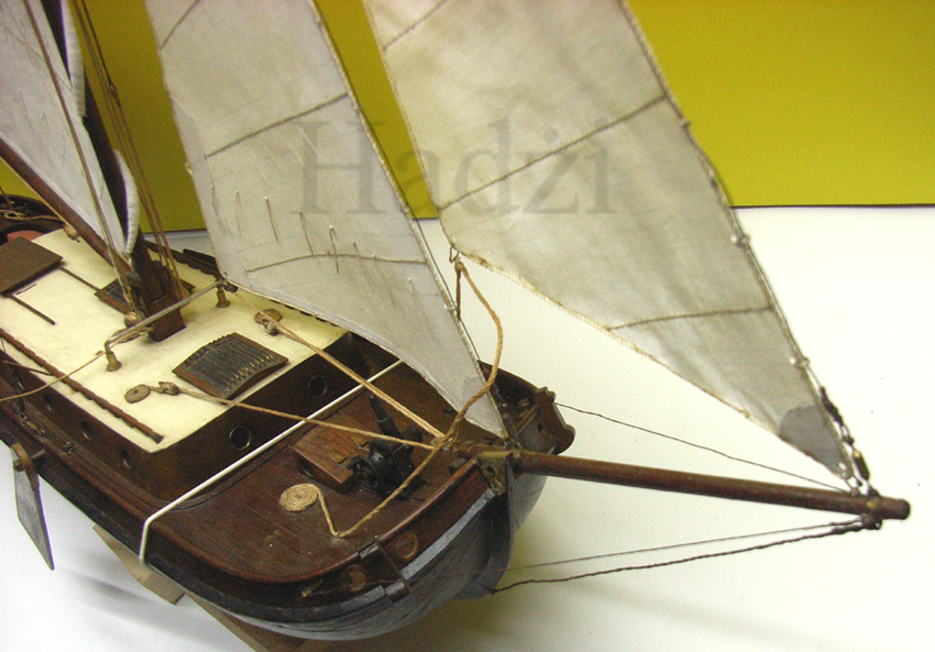Kliwer postawiony. Czyli żagle już w komplecie. Zostało jeszcze zawiesić wanty z oliwania stałego. Do doklejenia pozostał drobiazgi z wyposażenia, założenie steru i do wykonania dwie kotwice. Jedna admiralicji i Danfortha. Dorobić też muszę flagsztok i banderę holenderską. Pierwotnie jej nie wykonałem. Oczywiście gablotkę też. Poniżej stan obecny.