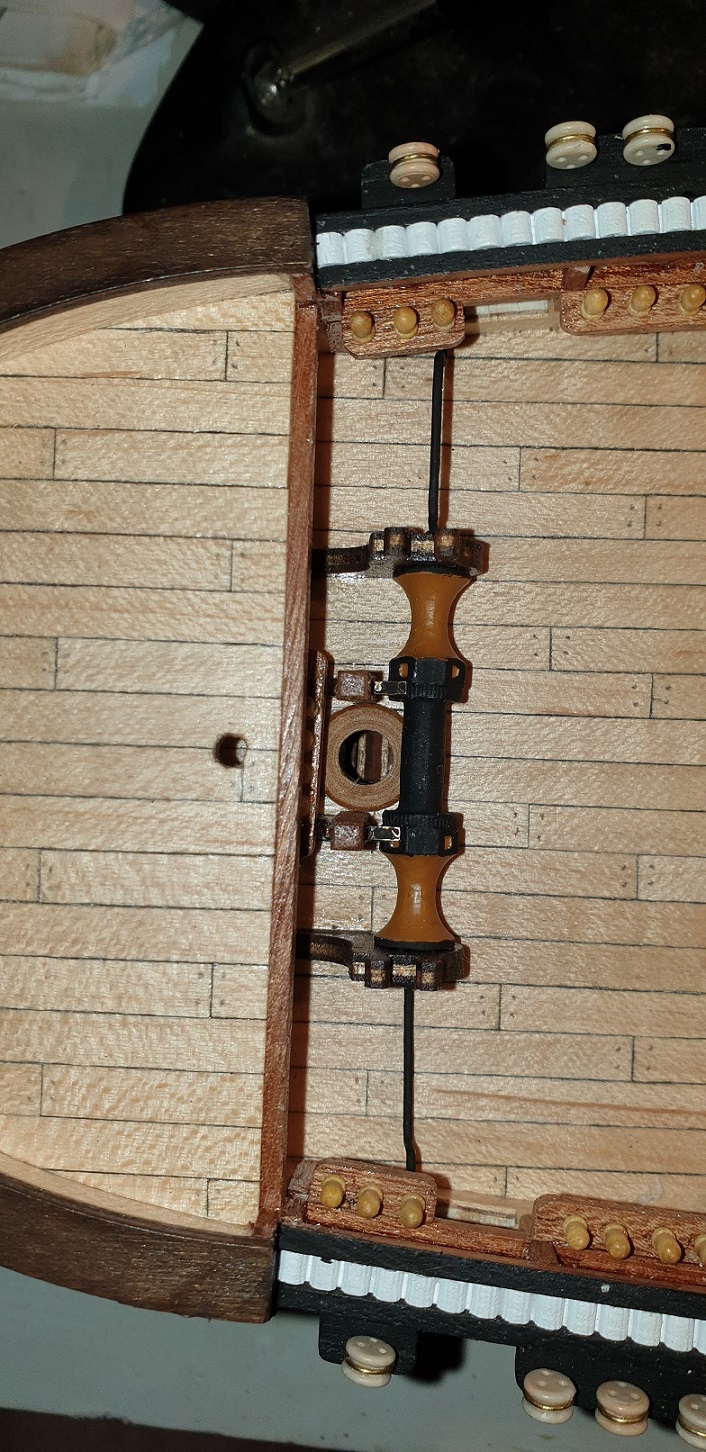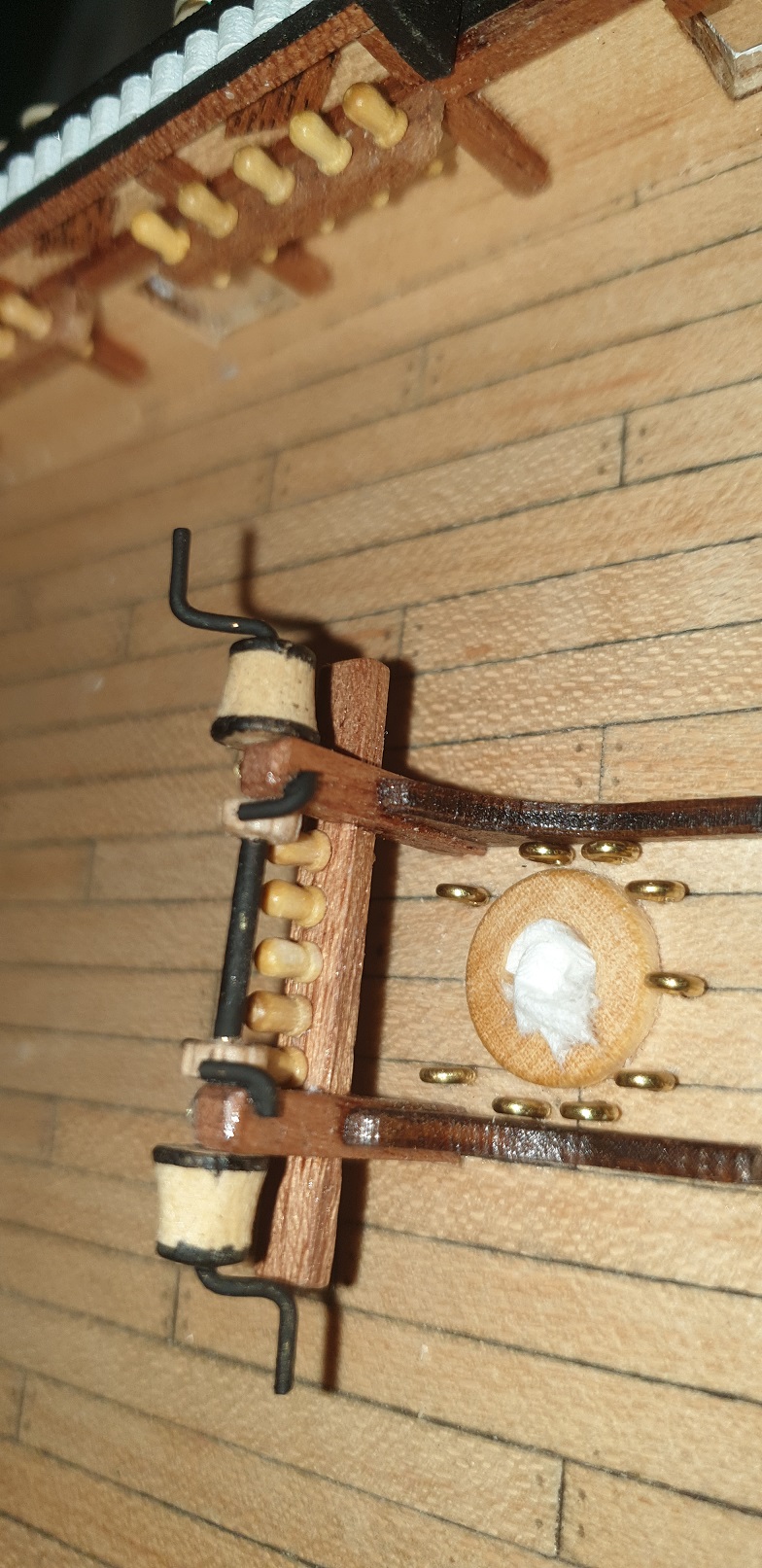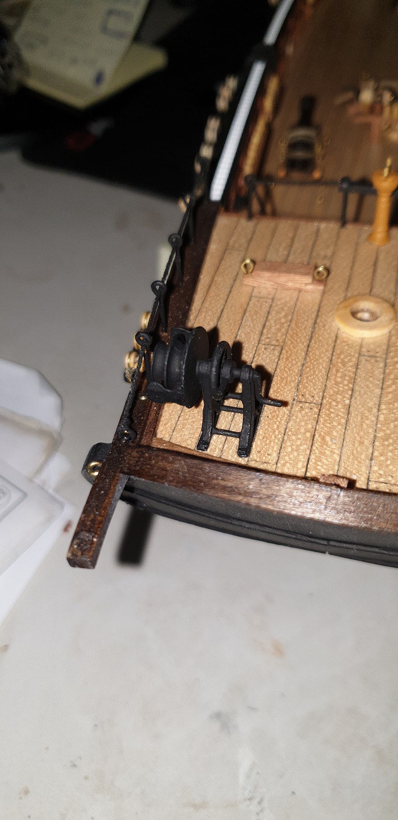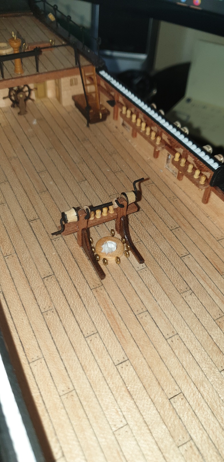 Schody/drabiny powinieneś poprawić - powinny być zamontowane bardziej pionowo - zauważ, że na załączonym przez Ciebie rysunku/planie ze str. 75, dolne końce schodow leżą tuż obok ok. 1/3 długości tej krótszej półki talrepowej z trzema naglami, podczas gdy w Twoim modelu są one bardziej ku rufie, tam gdzie w/w półka się kończy. Czyli leżą pod zbyt małym kątem. Jeśli zmienisz kąt ustawienia owych schodów, będzie wystarczająco miejsca dla w/w korb od kołowrotu.