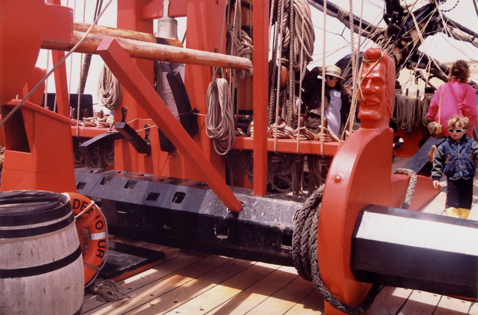 A tak to wyglada na australijskiej replice barku Endeavour - (tutaj zamiast owych korb sa wstawiane w beben tzw. handszpaki (handspikes) ktorymi obracano bebnem - jeden z nich jest widoczny, pomalowany na czerwono. Widac tez na pionowych belkach od dzwonnicy (pawl bits) te metalowe, czarne zapadki (pawls) - tu w pozycji uniesionej, co pozwala na obustronne obracanie bebnem. Podczas wciagania kotwic, zapadki te sa opuszczane i ich konce wnikaja w naciecia w bebnie, blokujac samoczynne odkrecanie sie kolowrotu.