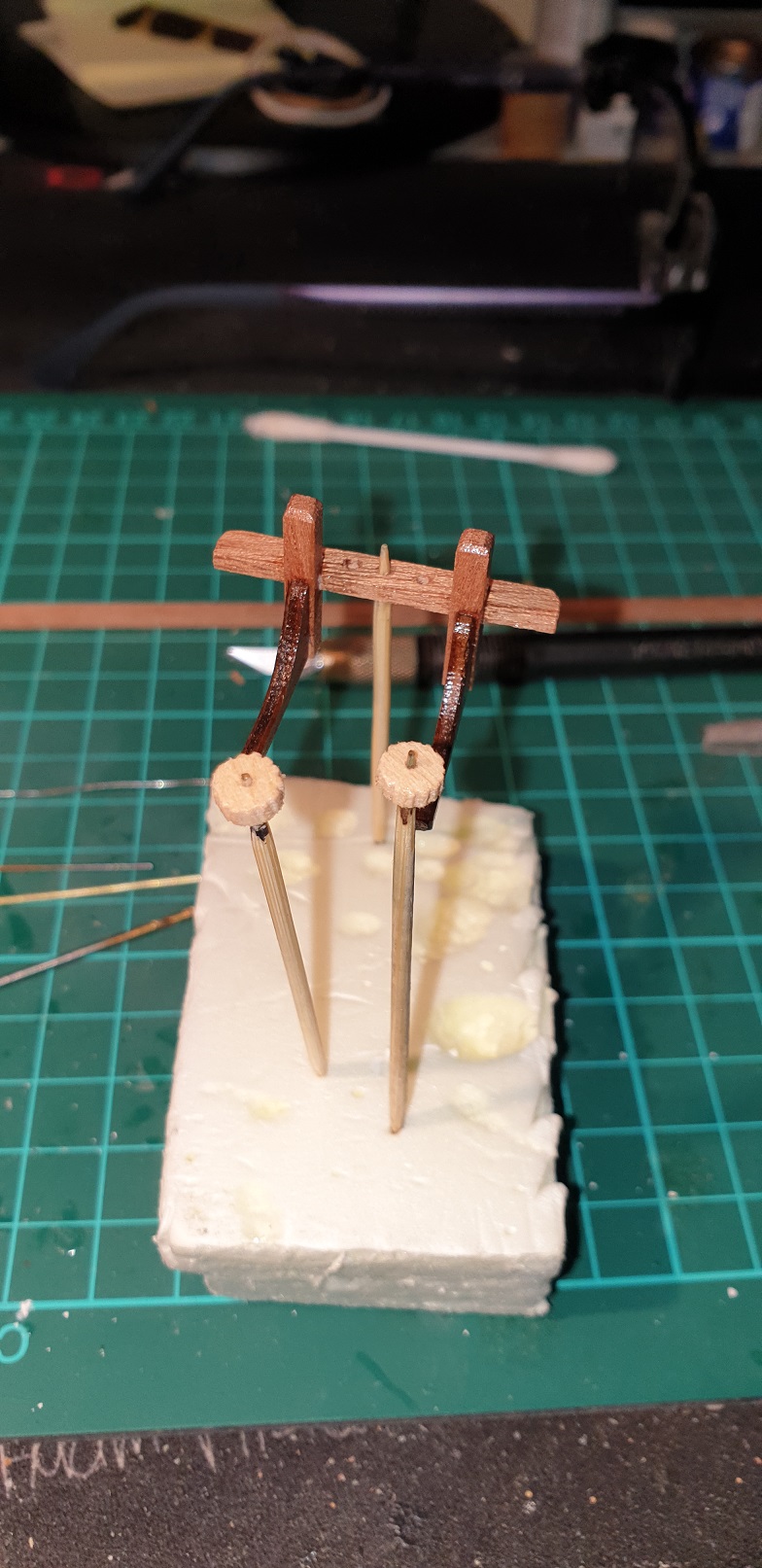 Myśle też, ze nie trzeba skracać tych wsporników do Kołowrotu, by tam dostawić te pachoły - na Twoim rysunku/planie z książeczki widać wyraźnie, że ta pozioma belka od w/w pachołów leży częściowo już pod forkasztelem (linia przerywana tam), pół-na-pół i otacza od przodu fokmaszt, przy czym od tyłu go otacza ten Kołowrót (Windlass).