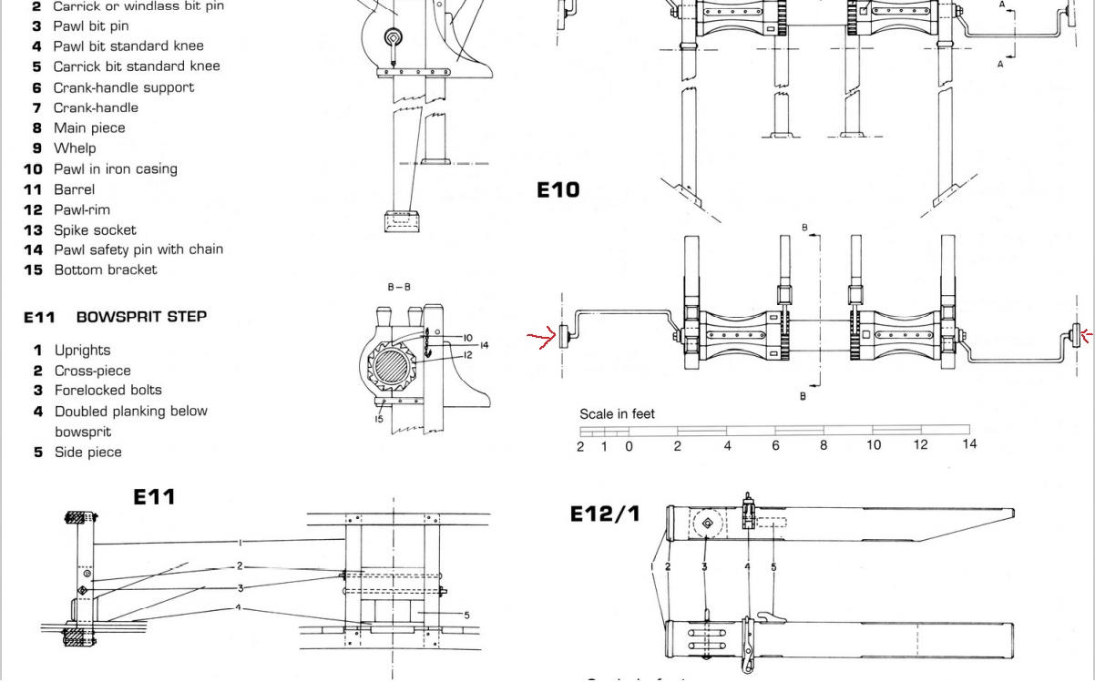 Na rysunku E5 masz tzw. "Main jeerbits with attached winch" (pachoły od głównego masztu z przylegającą doń Wyciągarką), a na rys. E10 jest "Windlass - Kołowrót z przynależnymi tam Fore topsail sheet bits" (pachoły od górnego żagla na fokmaszcie). Przestudiuj te rysunki uważnie.