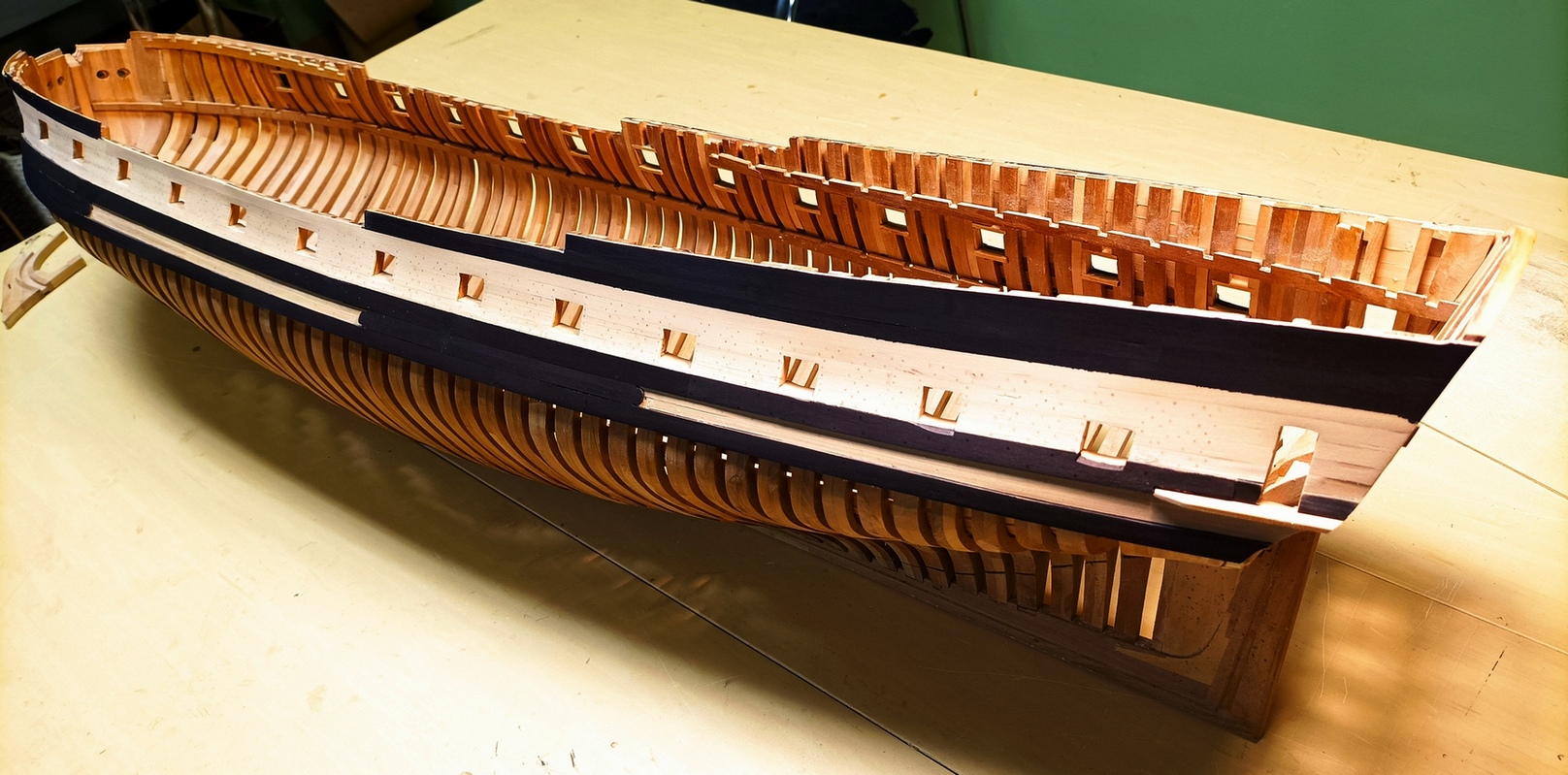 Prace nad wycięciem ambrazur zacząłem od naklejenia papierowych szablonów na szkielet.Potem żmudna walka z wycięciem i wklejeniem parapetów każdej z 26 furt. Trwało to kilka tygodni.Używałem najprostszych narzędzi. Poza piłką, ten nóż w środku był bardzo przydatny.Dalej wkleiłem poszycie wewnętrzne w części dennej i diagonalne na lewej burcie.Wbrew pozorom, wykonanie poszycia diagonalnego, nie jest trudne. W każdym razie łatwiejsze, niż klasyczne.
