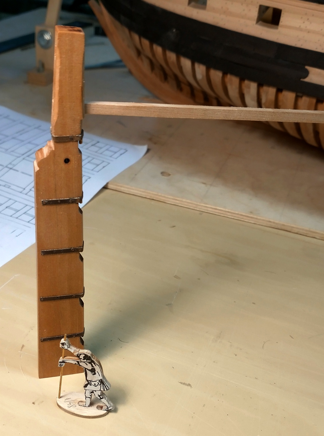 Tutaj małe przeoczenie. Zauważyłem to obrabiając zdjęcia. Na tym luku powinny być po dwa pokładniki pomocnicze. Nie będzie problemu z poprawieniem.Różnica w kolorze pokładników wynika z tego, że główne są pokostowane, reszta jest jeszcze surowa.Tutaj mechanizm steru. Nie jest to szczegółowo wyrysowane w planach, opierałem się na literaturze i relacji Kazka. Wygląda to trochę inaczej niż u Kazia, ale też działa tyle, że dość ciężko, bo nie udało się zadbać o odpowiedni luz między rumplem steru, a prowadnicą.Tu elementy mechanizmu przed wklejeniem.