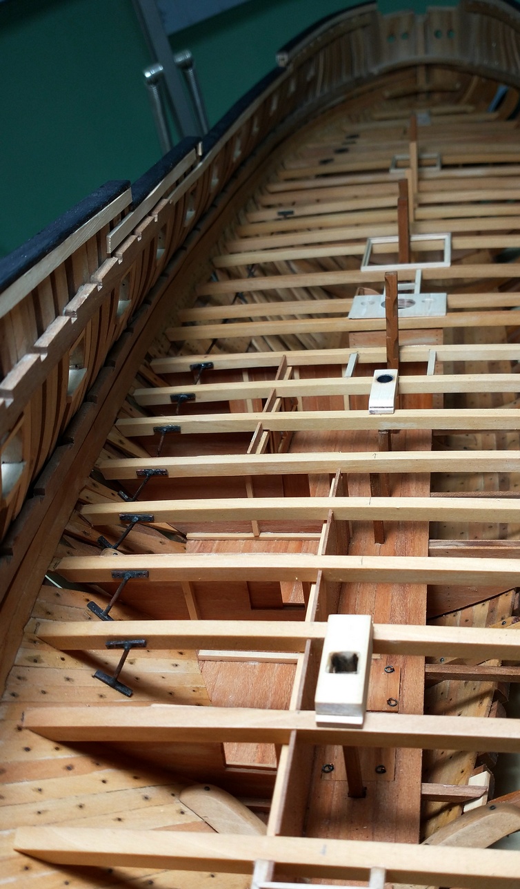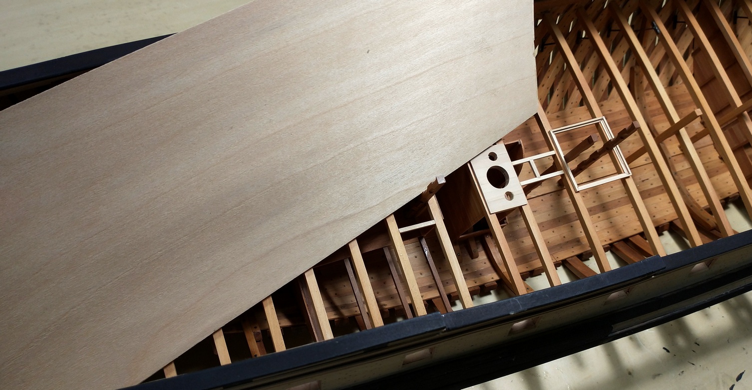 Pokładniki są umocowane na swoich pozycjach, ale oczywiście można je wyjąć. Samo wycięcie i dopasowanie kosztowało już sporo czasu, a to dopiero początek. Teraz trzeba wyciąć wszystkie wpusty, felce i otwory. zejdzie z miesiąc jak obszył. :) Ale i tak najtrudniejsze będzie wykonanie mosiężnych wzmocnień.