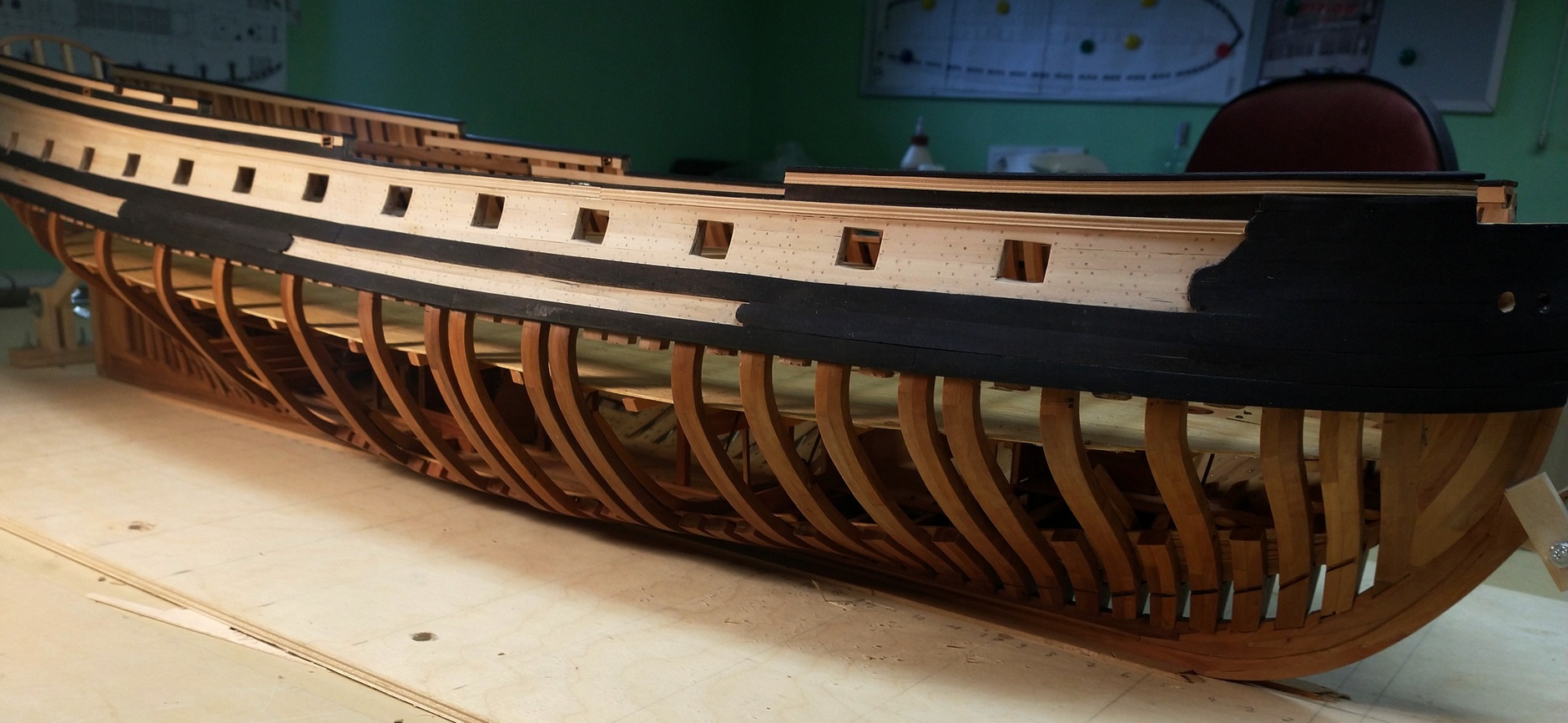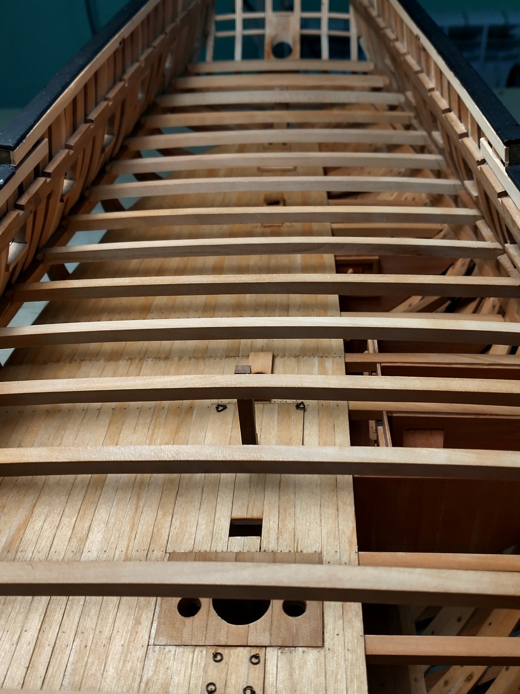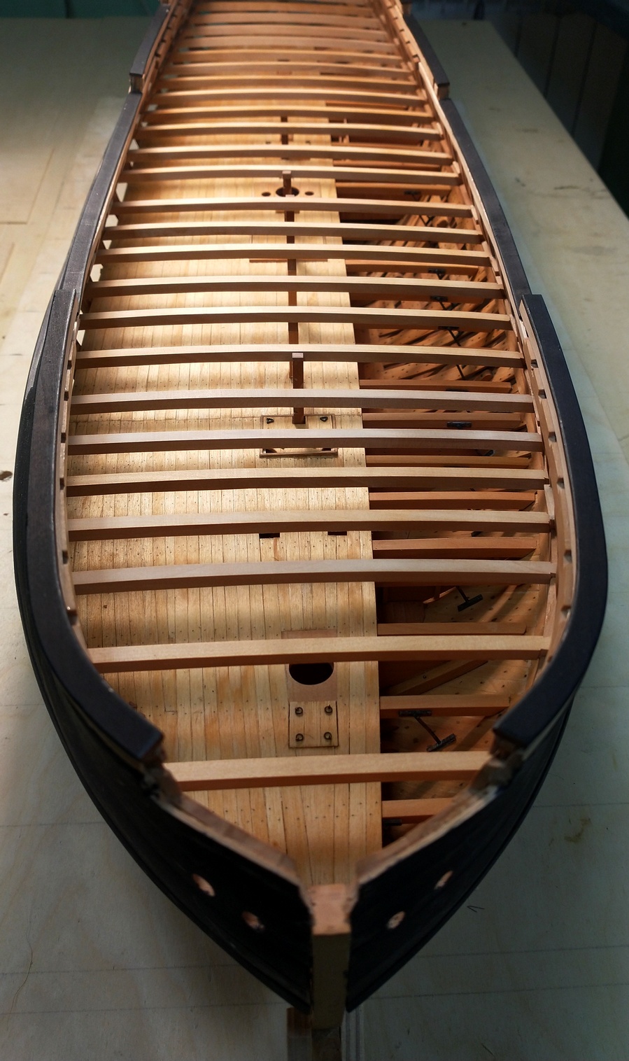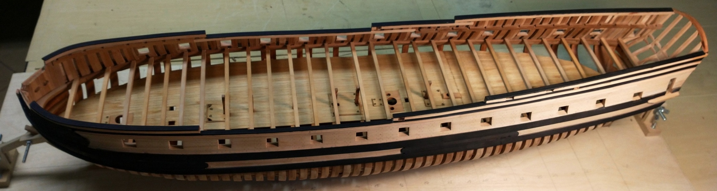 Pokleiłem dolny pokład i zacząłem prace nad pokładnikami głównego.