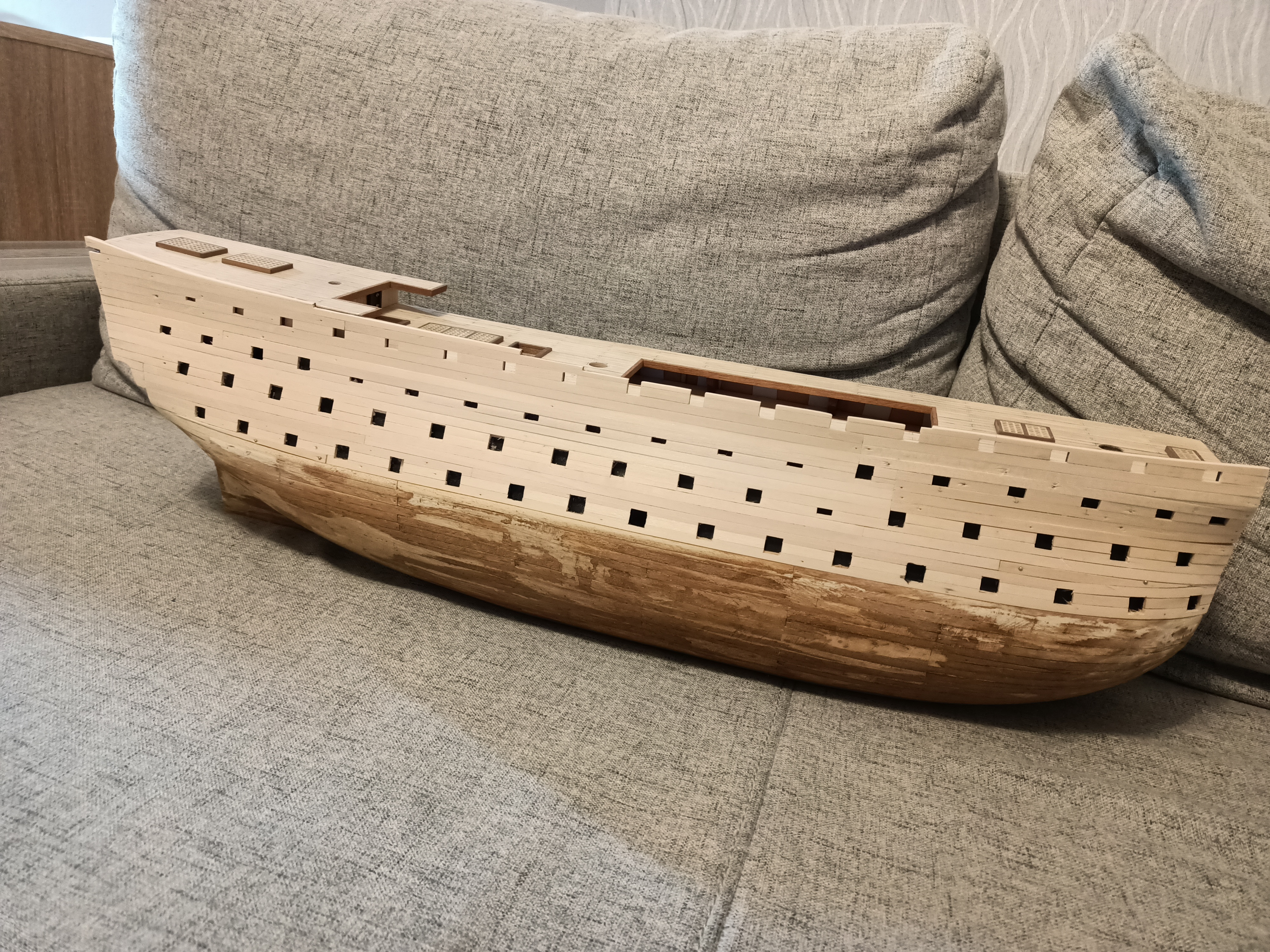 Ostatni poziom prawej burty listwa przyklejona, troszkę się bałem że co nie będzie pasować względem pokładu, ale jak na razie pasuje bardzo dobrze.