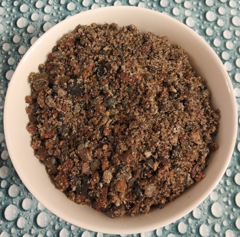 Z kamyków zrezygnowałem, a kulki po odtłuszczeniu w benzynie, przetoczyłem po placku beżowej farby. Po ułożeniu kulek w pojemniku potraktowałem całość matowym lakierem bezbarwnym, który całość posklejał