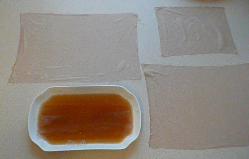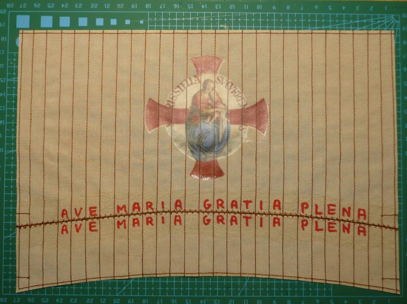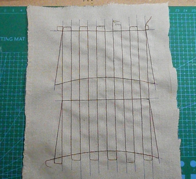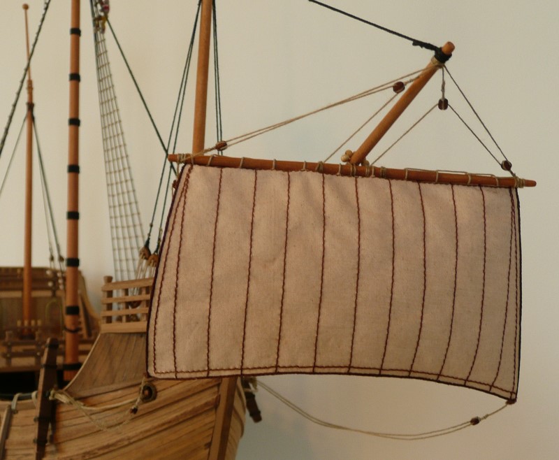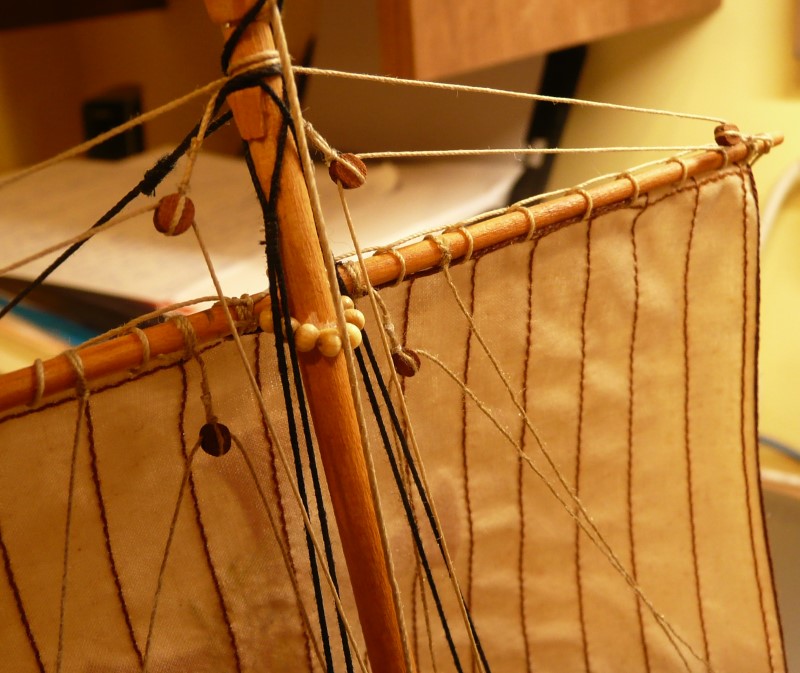 Wróćmy do żagli. Kolejne standardowe operacje to: farbowanie w herbacie, krochmalenie, prasowanie, narysowanie obrysów i brytów, a dalej szycie, wycięcie i doklejenie likliny. Do rysowania użyłem pisaka żelowego - po przeprasowaniu rysunek znika. Na koniec przyszycie do reji. Igła z podwójnie złożoną linką robiła za duże otwory na brzegu żagla. Otwory nakłuwałem więc pinezką, a następnie przewlekałem linkę z zakończeniem usztywnionym klejem CA.
